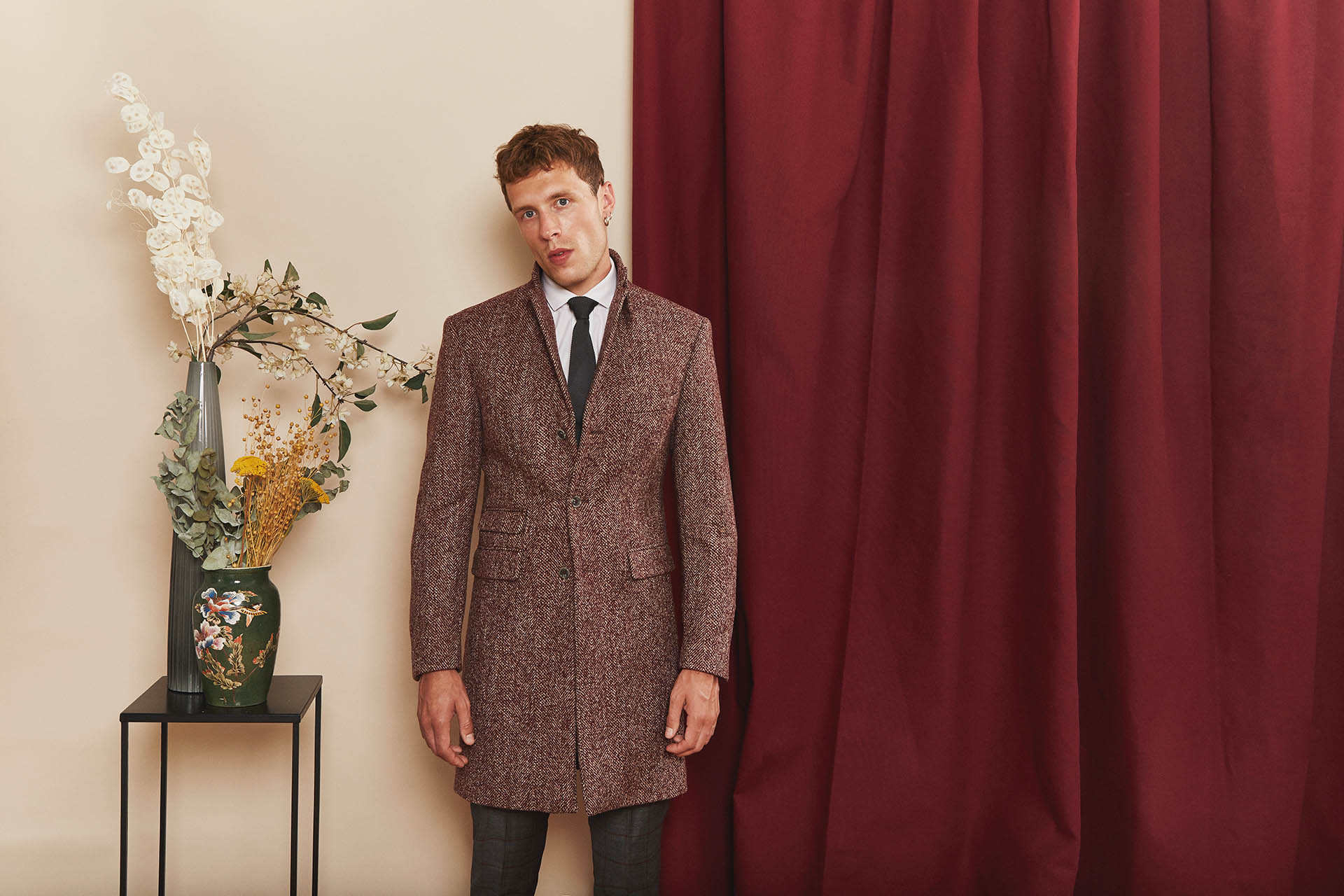 Manteau sur mesure, modèle droit avec col à cran ouvert, 3 boutons et 3 poches droites à rabats.