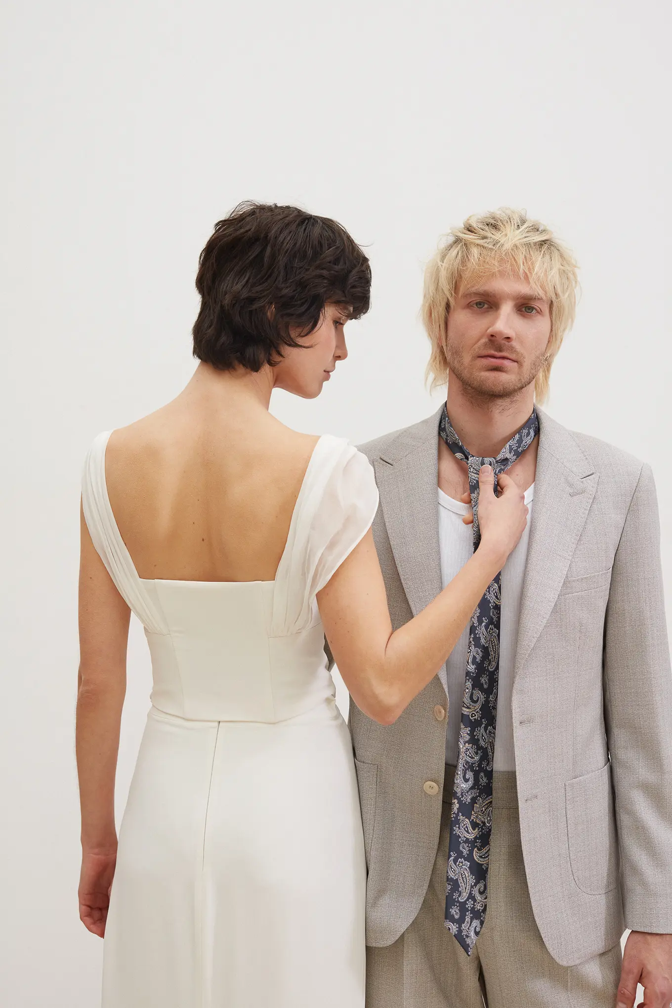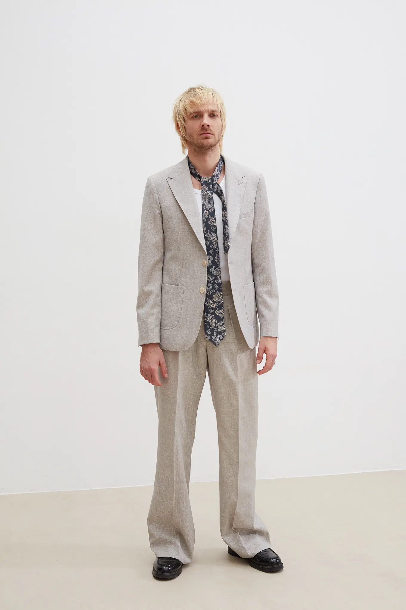 Costume 2 pièces en toile chinée beige grisée sur mesure – 1090 €