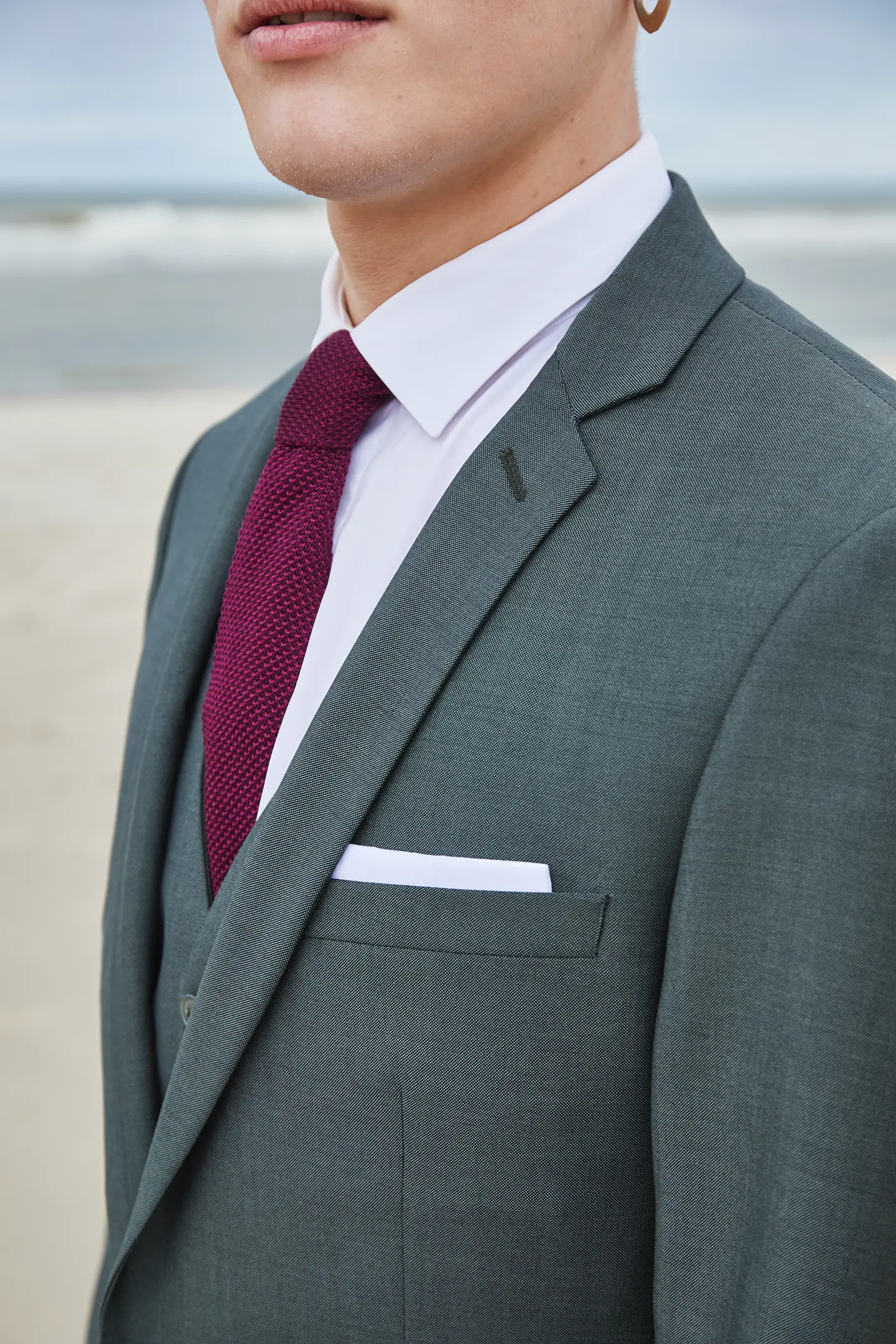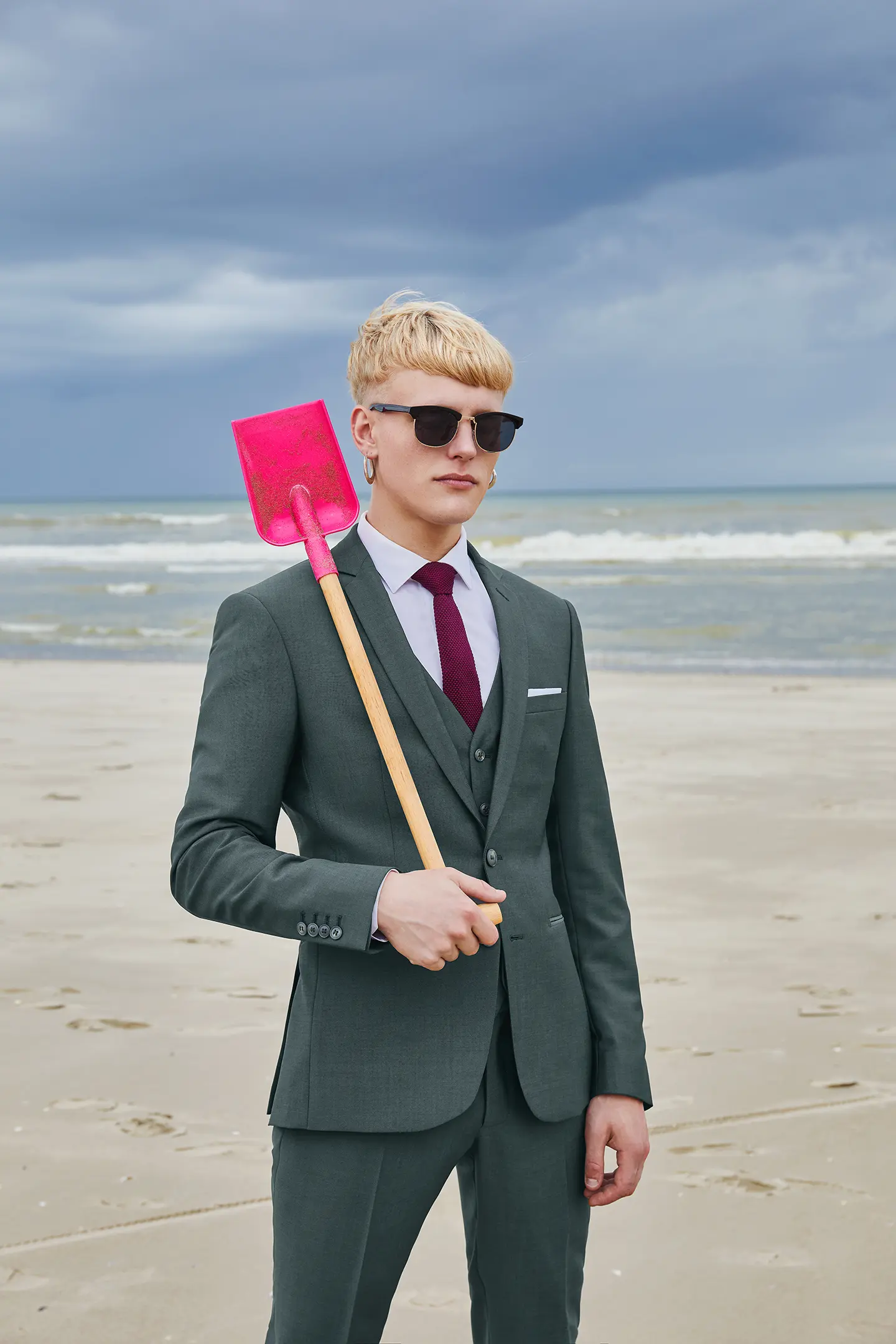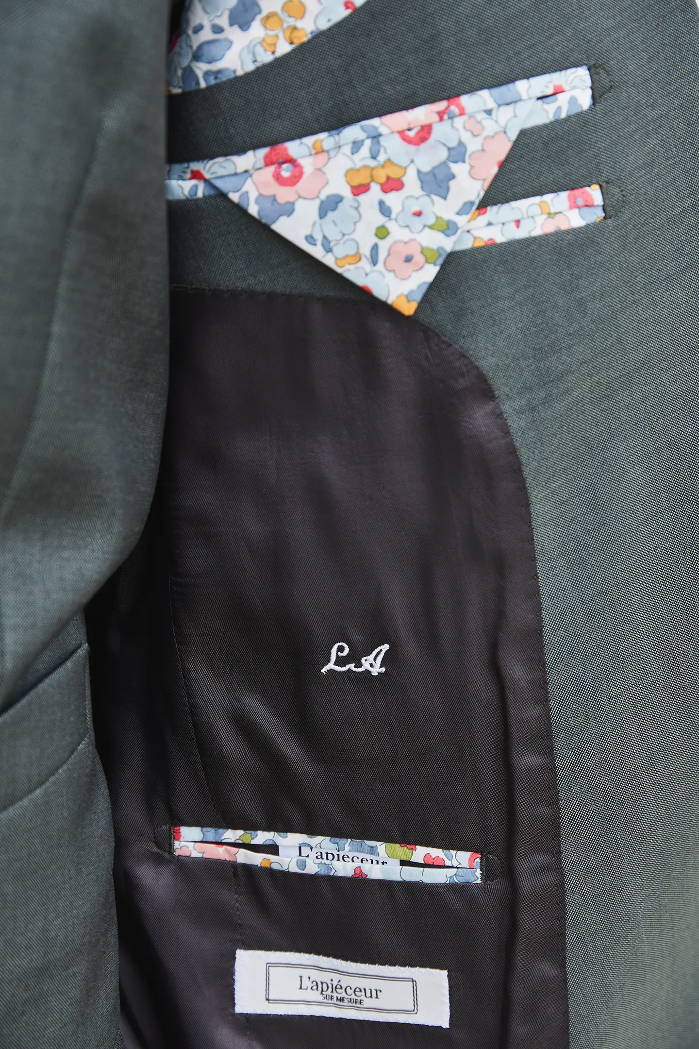 Costume 3 pièces sur mesure avec une veste à col doit, 2 boutons, 3 poches passepoilées droites et un gilet droit.