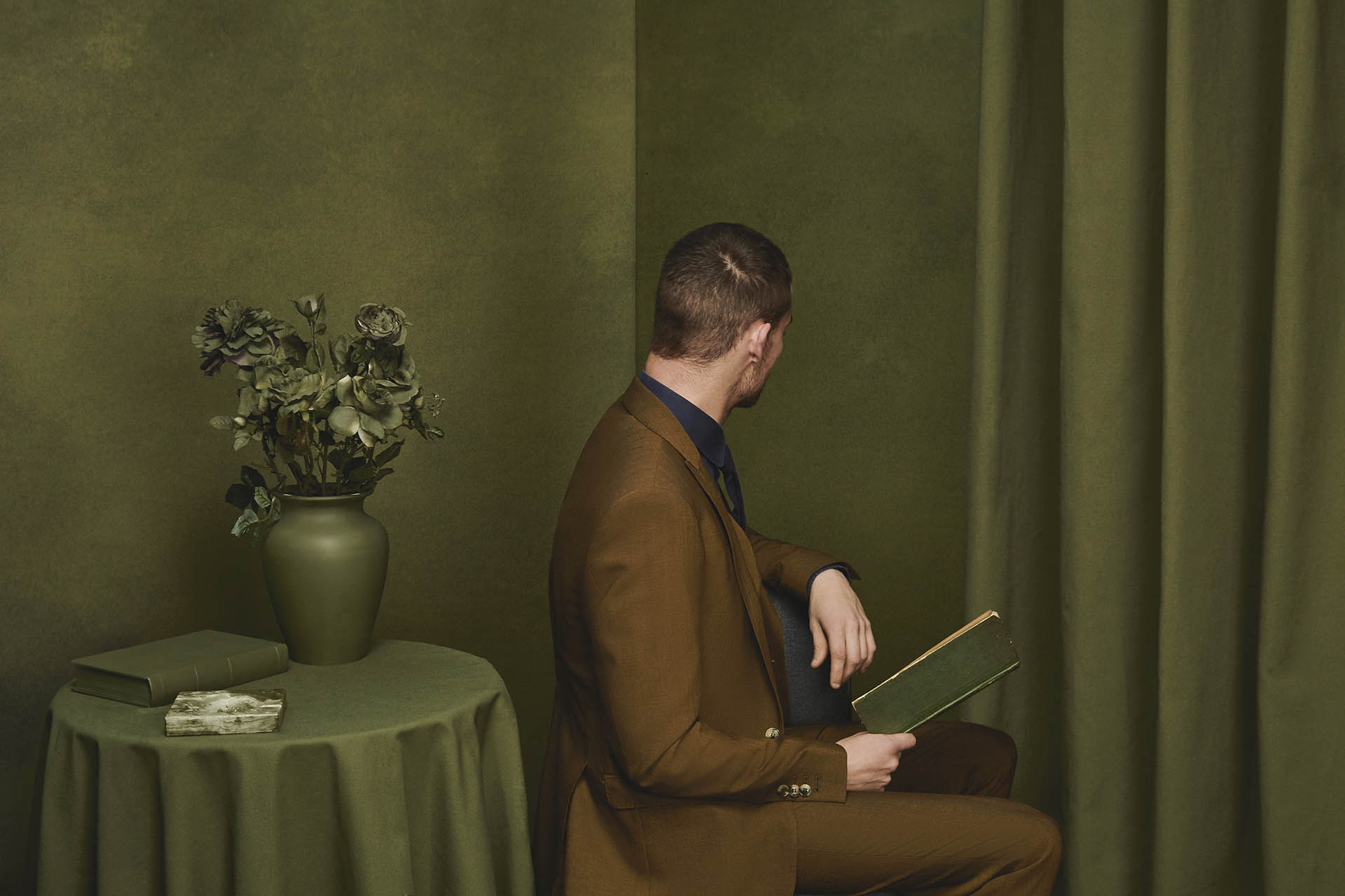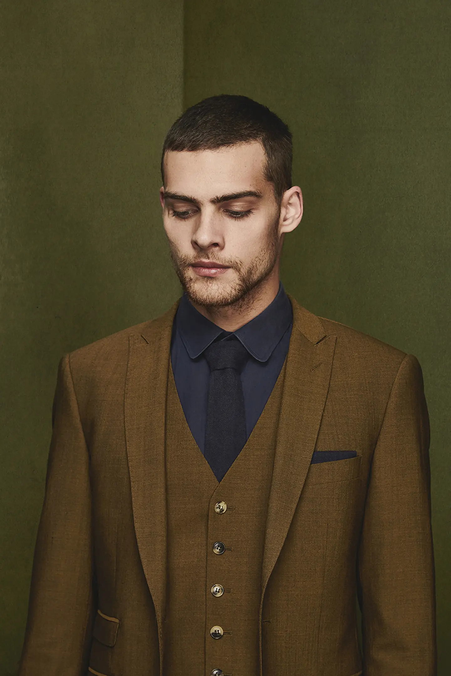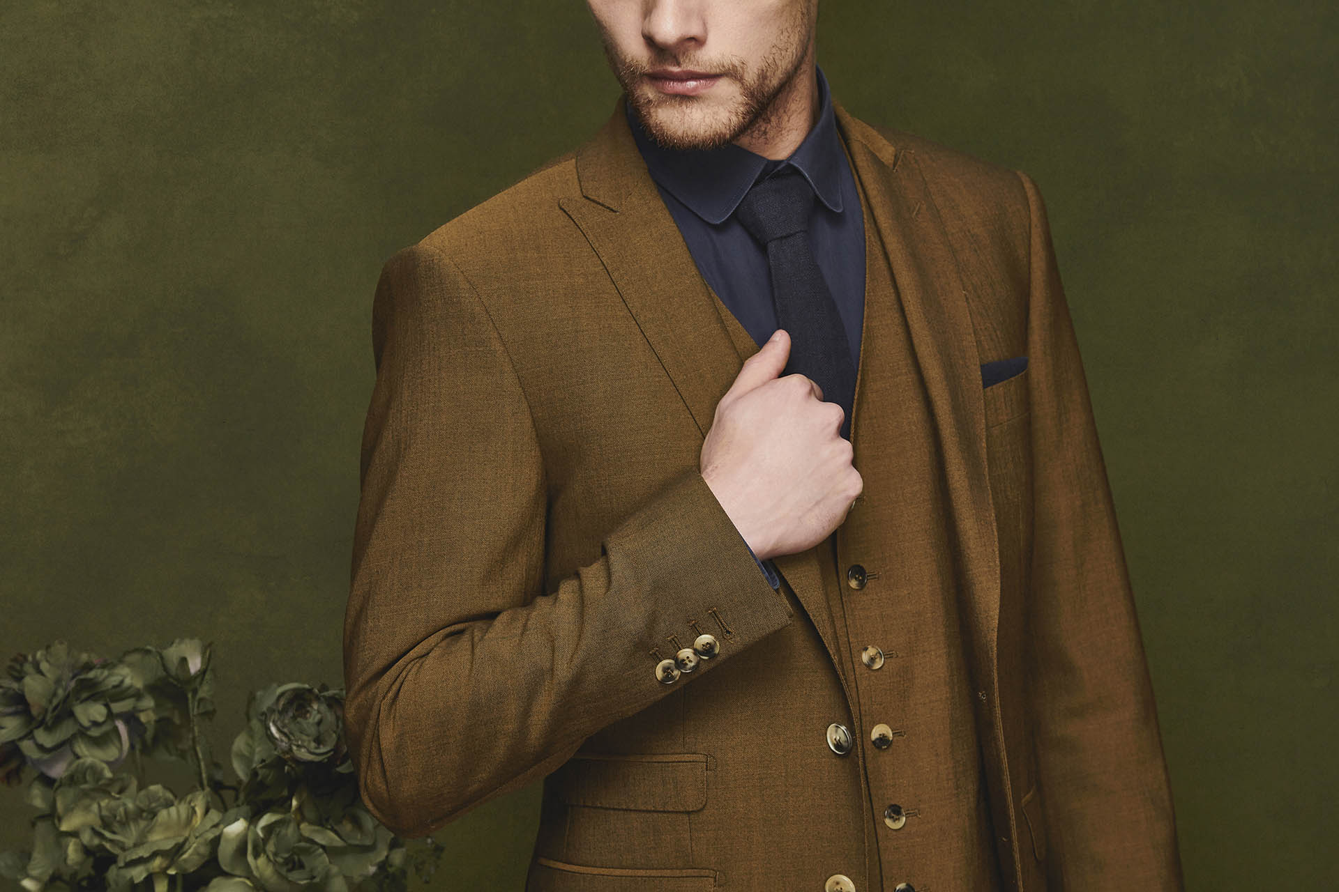 Costume 3 pièces sur mesure avec une veste à col pointe surpiqué, 2 boutons, 3 poches à rabat et un gilet droit.