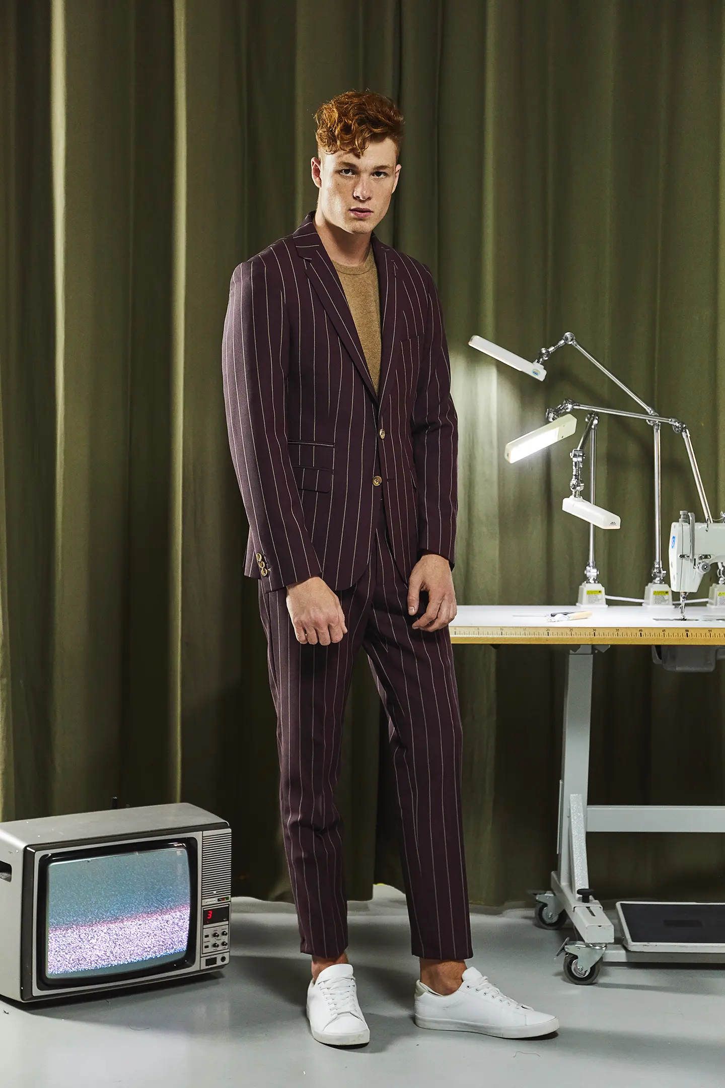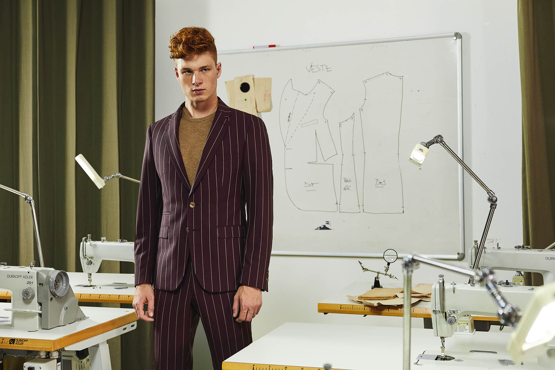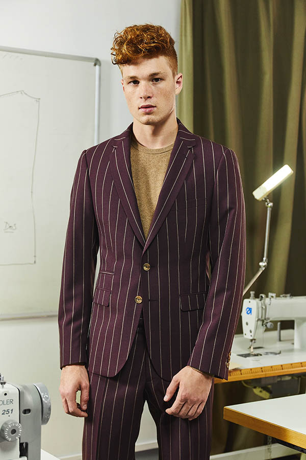 Costume 2 pièces sur mesure avec une veste à col droit, 2 boutons contrastés, 2 poches droites à rabats et une poche ticket passepoilée.