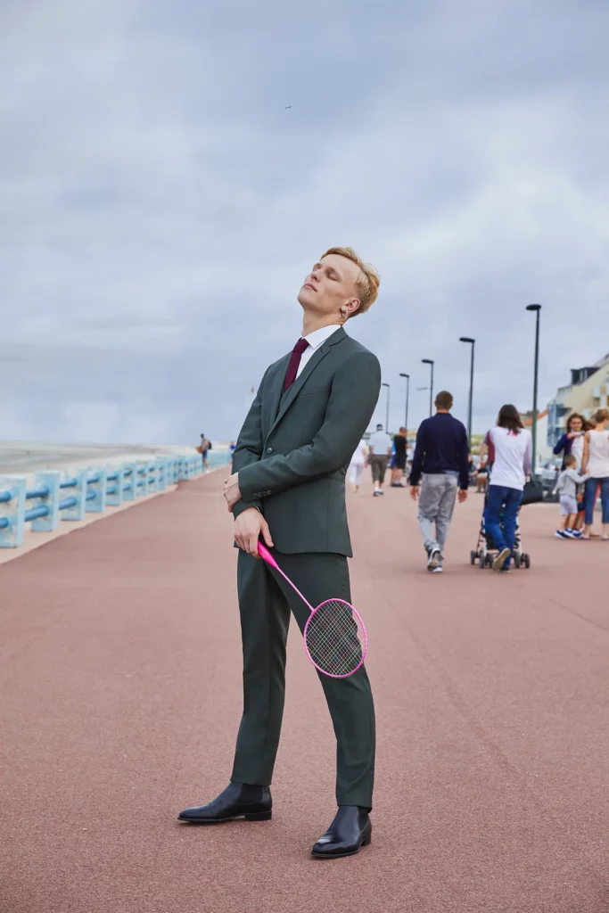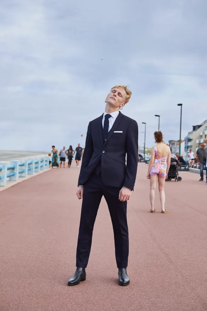 Costume 2 pièces sur mesure avec une veste à col châle, 1 bouton et 2 poches passepoilées en biais.