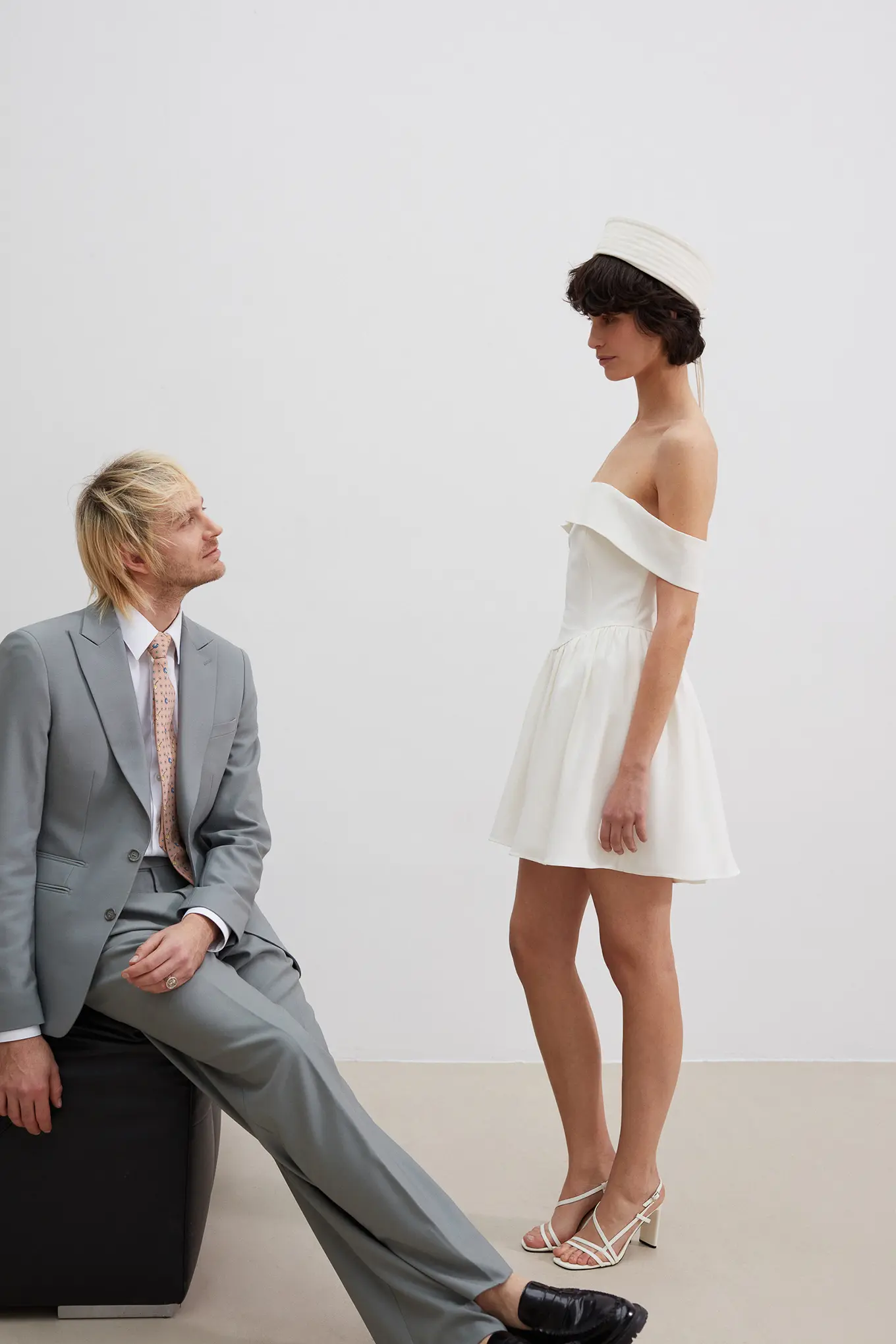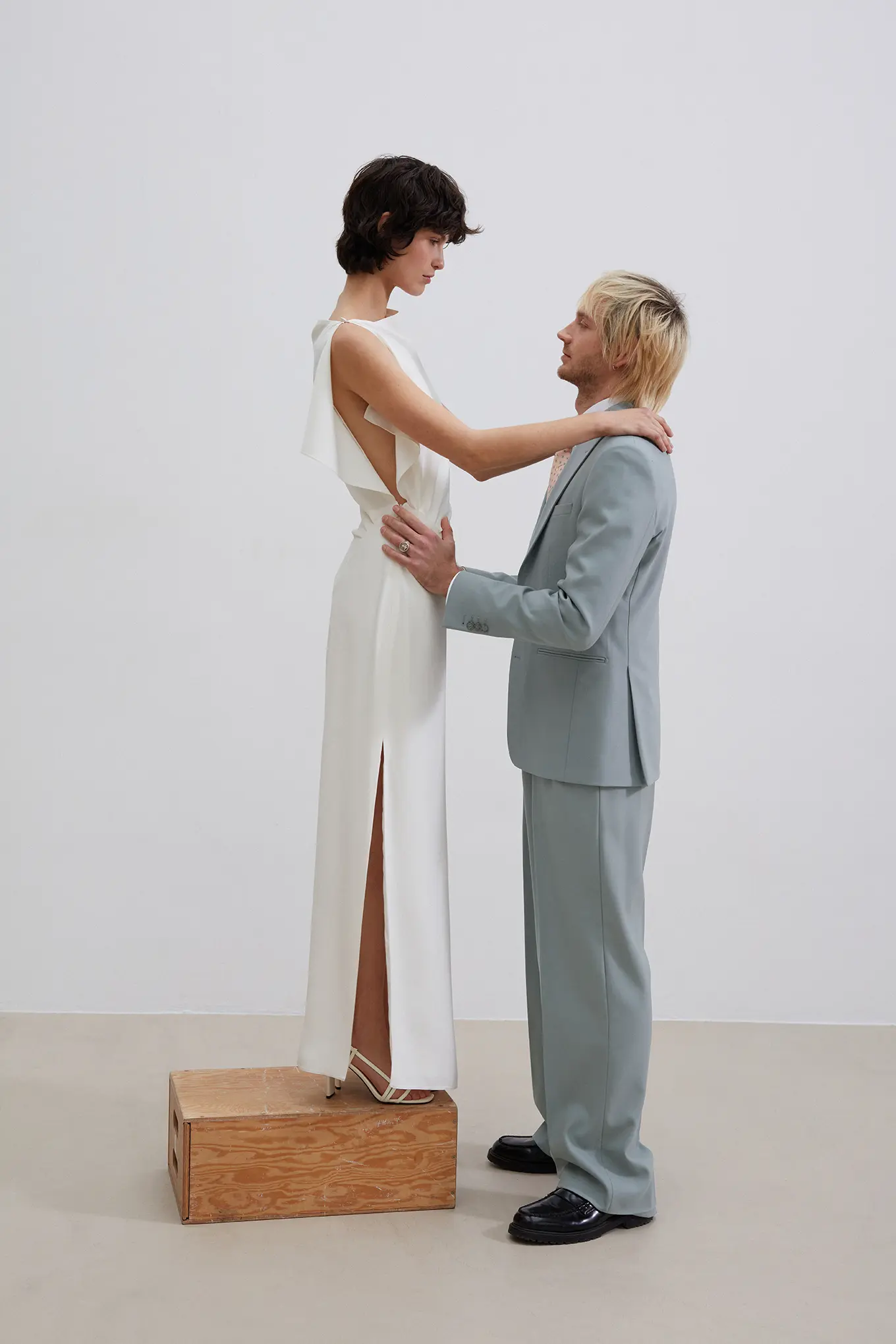 Costume 2 pièces en serge vert de gris pastel sur mesure – 1090€