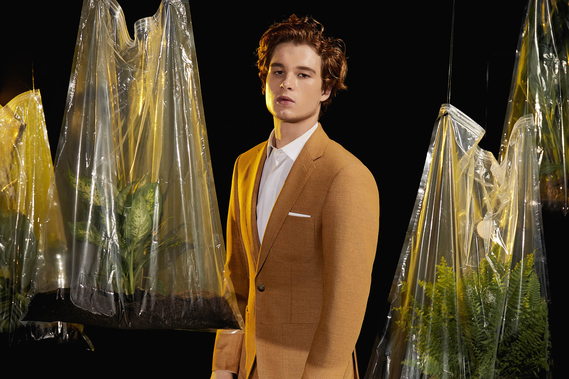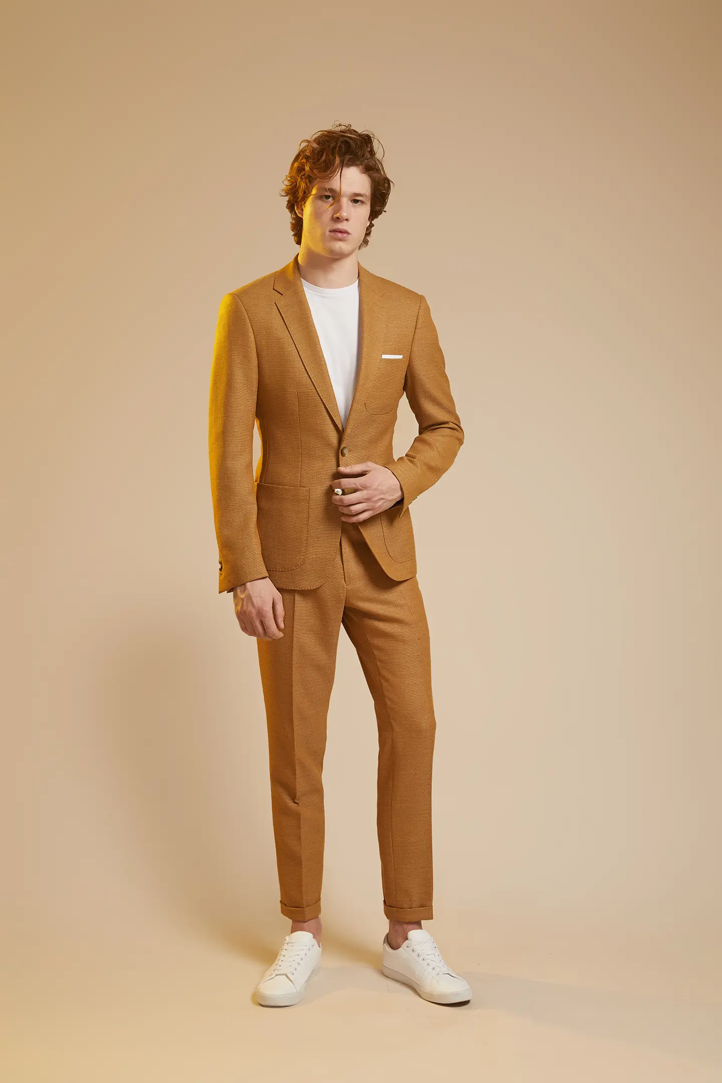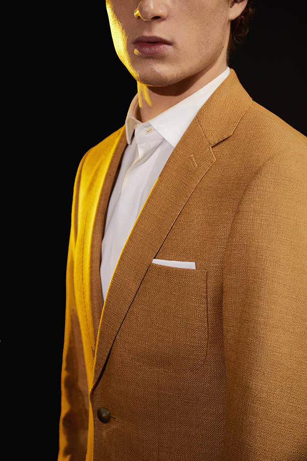 Costume sur mesure 2 pièces avec une veste à col droit surpiqué, boutons nacrés et 3 poches plaquées.