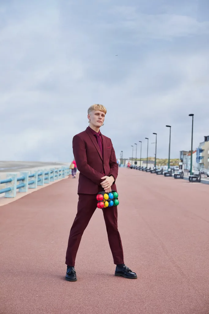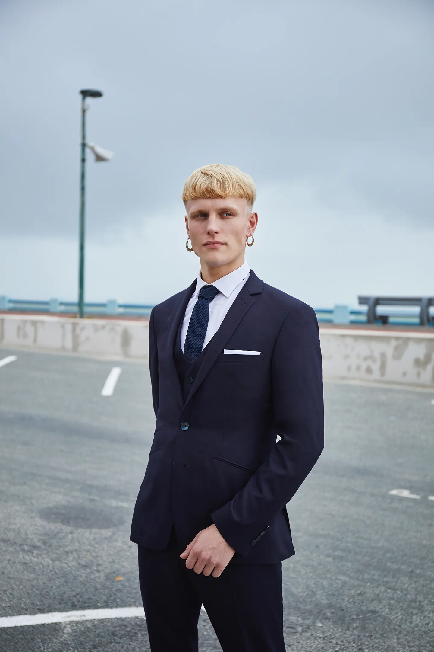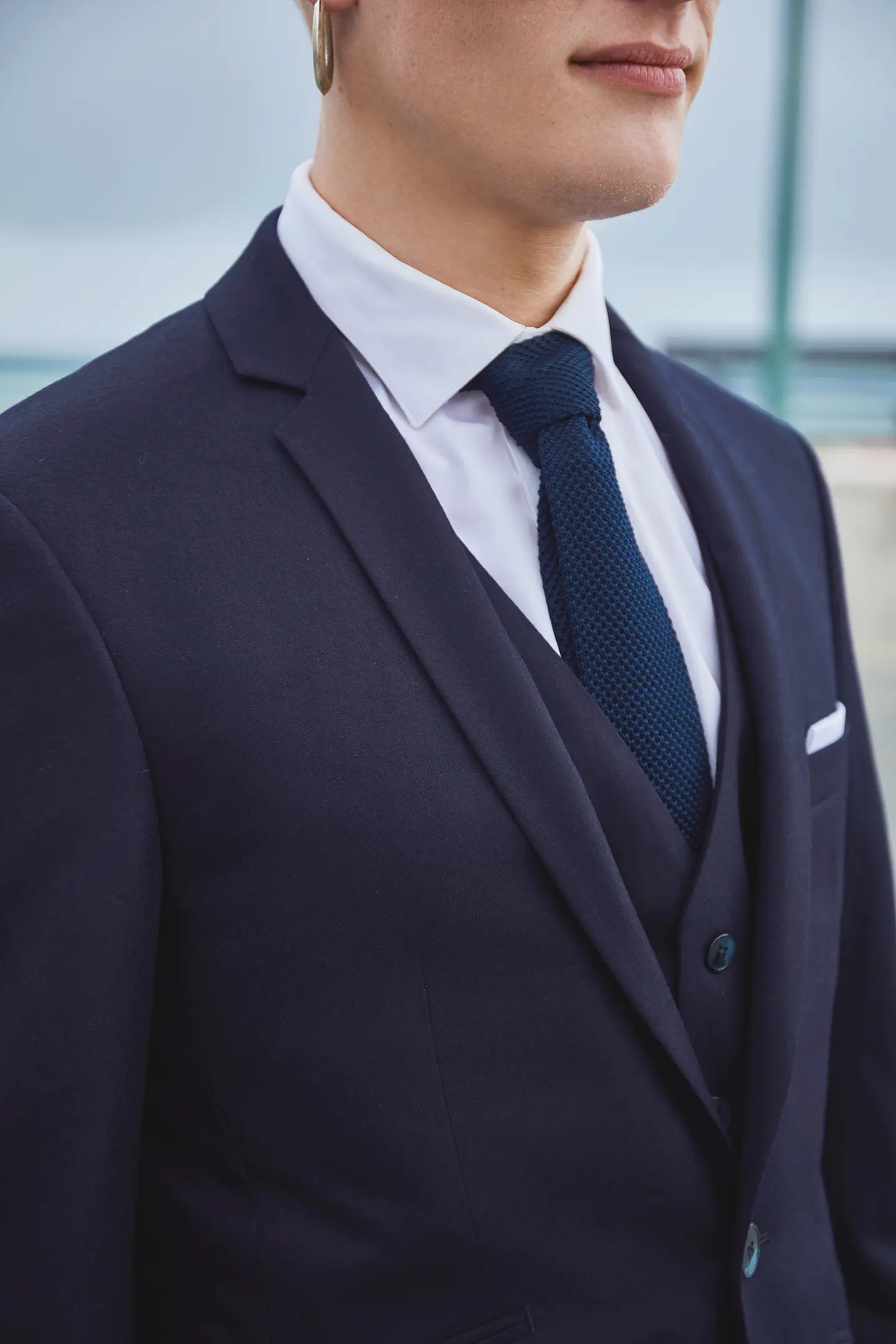 Costume 3 pièces sur mesure avec une veste à col droit, 2 boutons, 3 poches passepoilées en biais et un gilet droit.