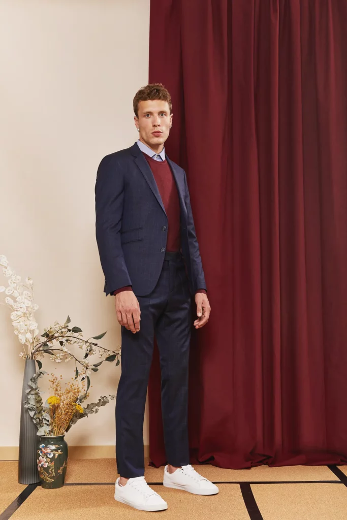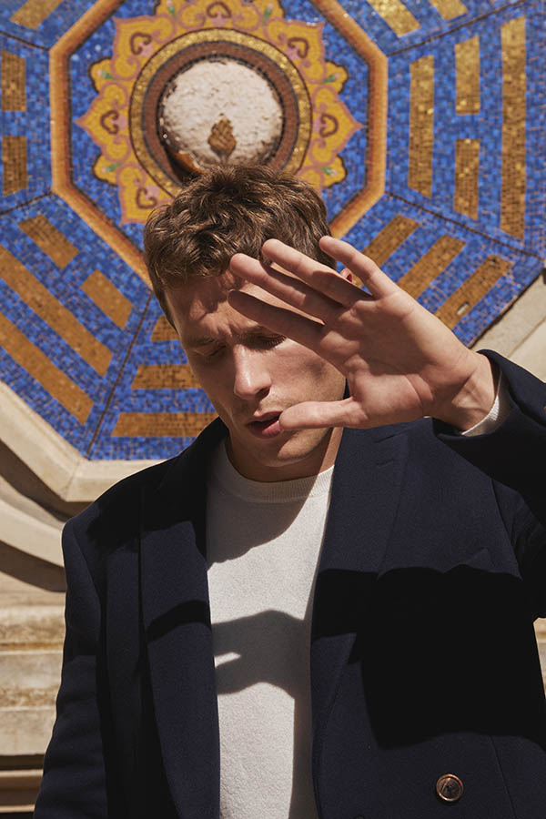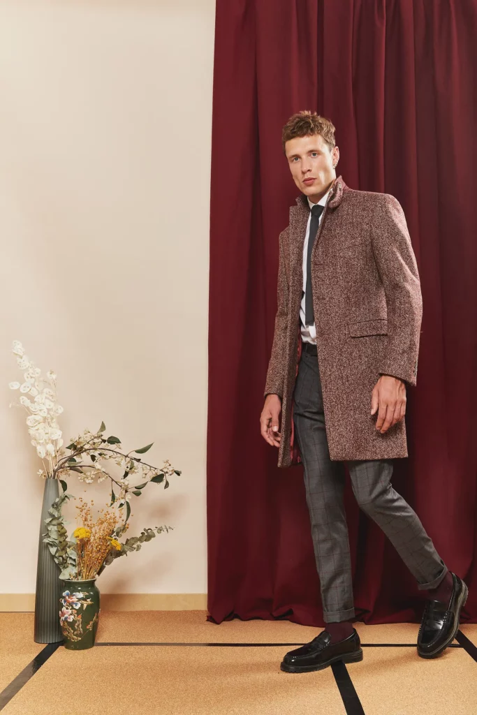 Manteau sur mesure, modèle croisé quatre boutons, avec un col pointe, des boutons en corne, 2 poches droites à rabats et 1 poche ticket passepoilée.