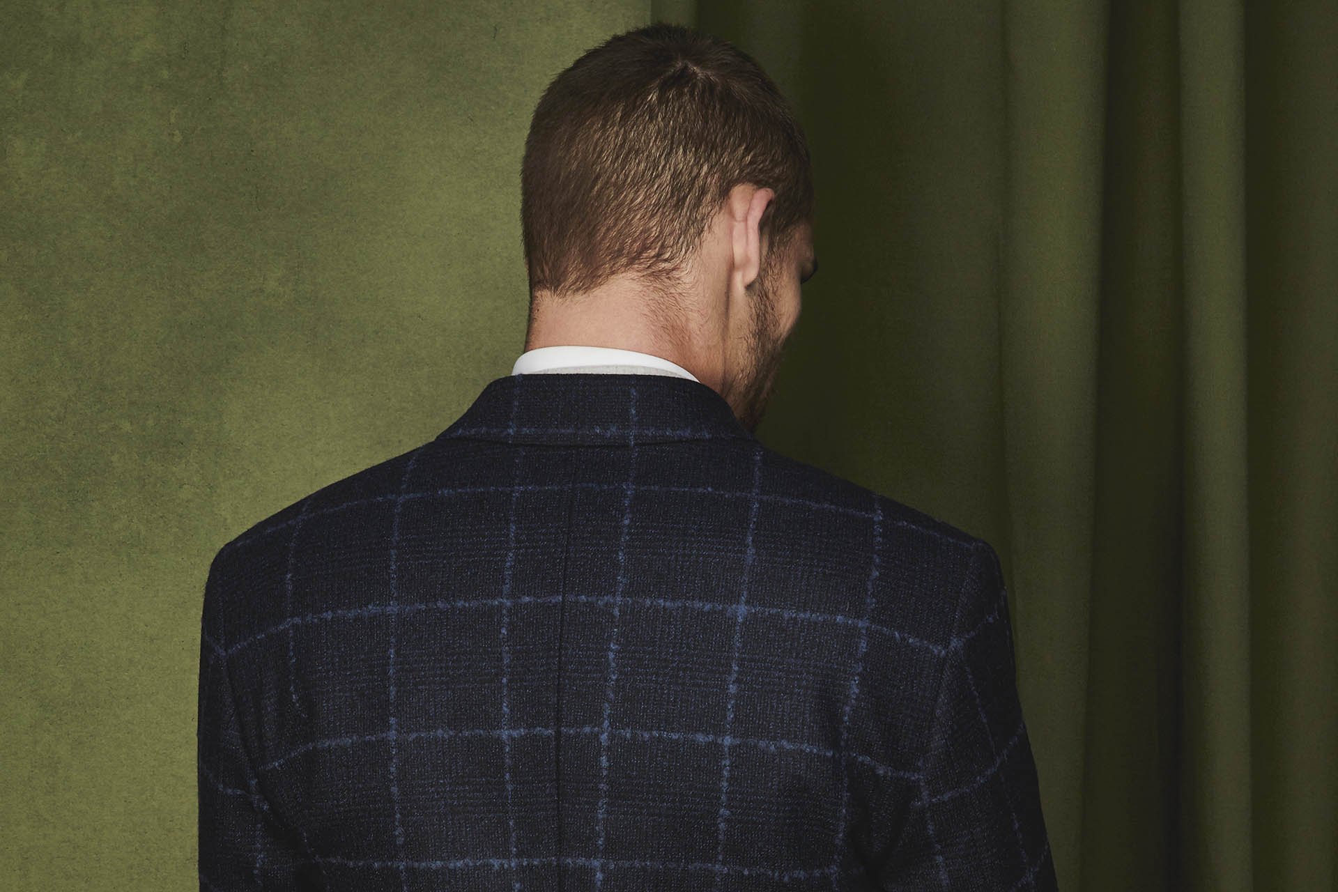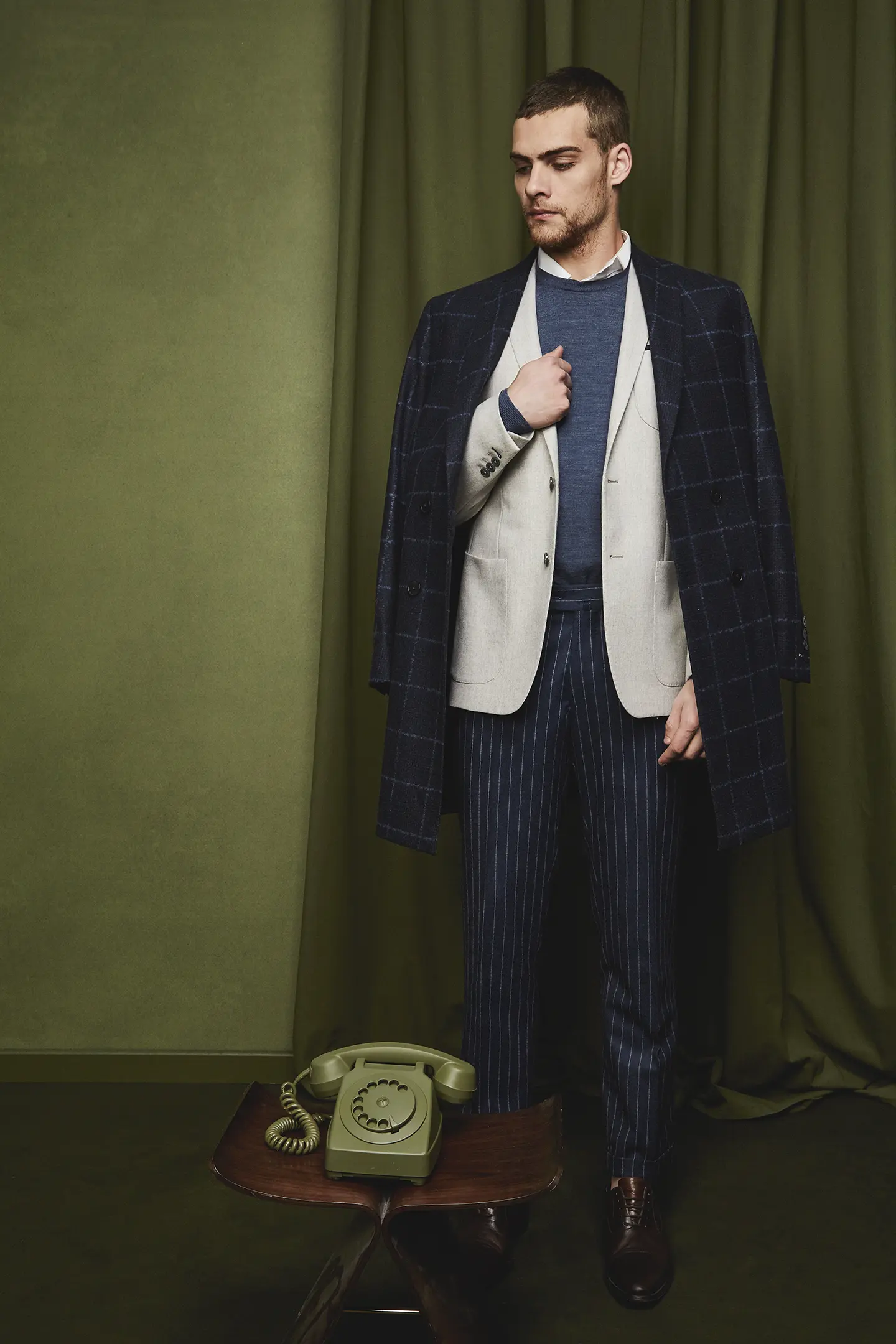 Manteau sur mesure croisé 4 boutons à un col pointe, avec 2 poches droites à rabats et une poche ticket passepoilée.