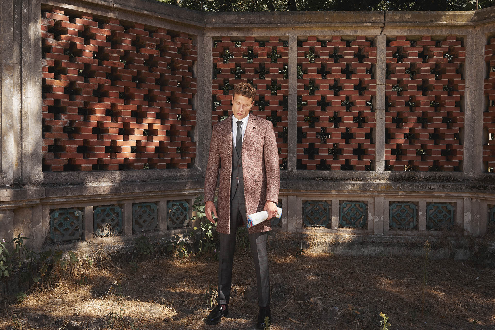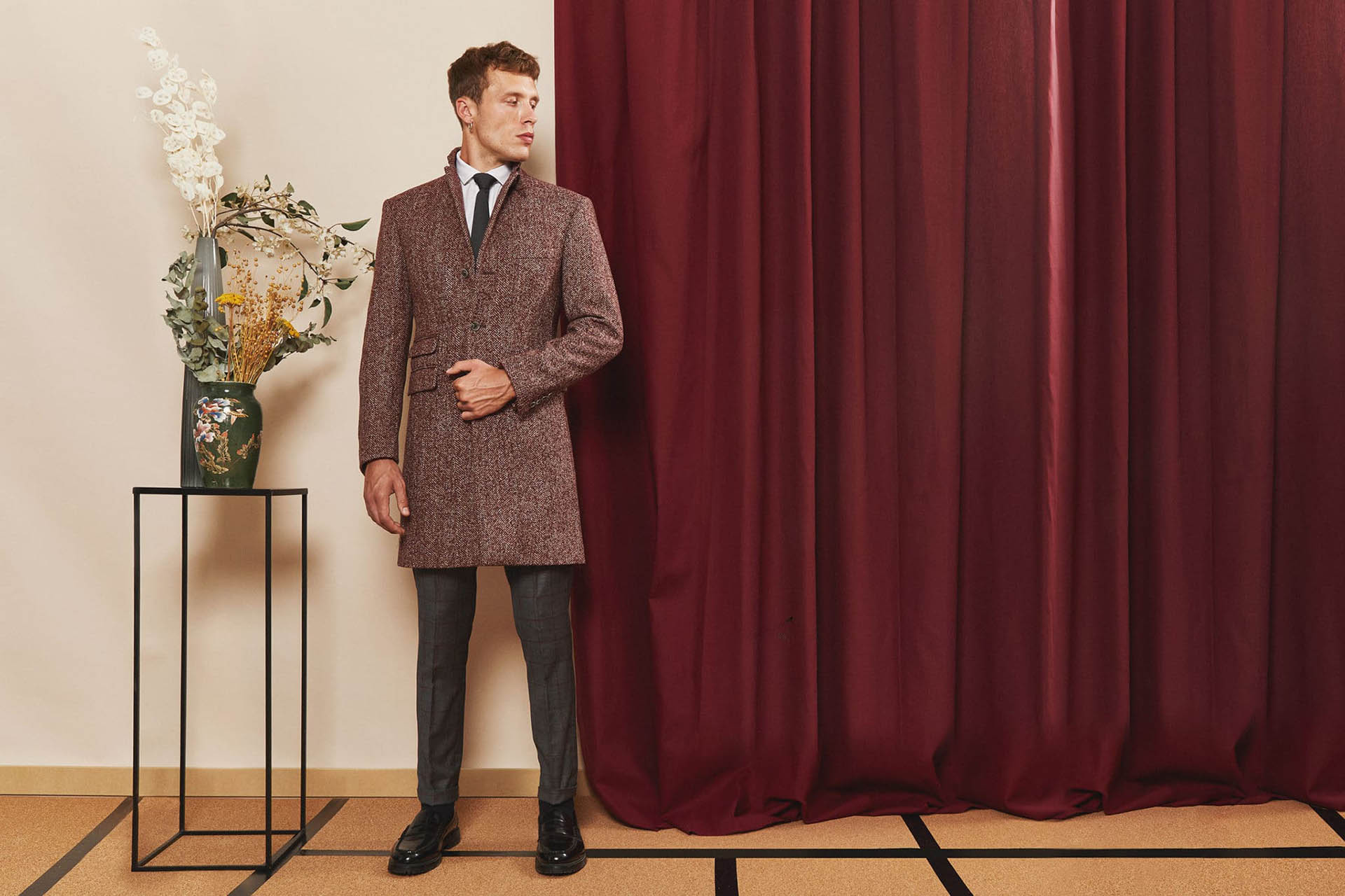 Manteau sur mesure, modèle droit avec col à cran ouvert, 3 boutons et 3 poches droites à rabats.