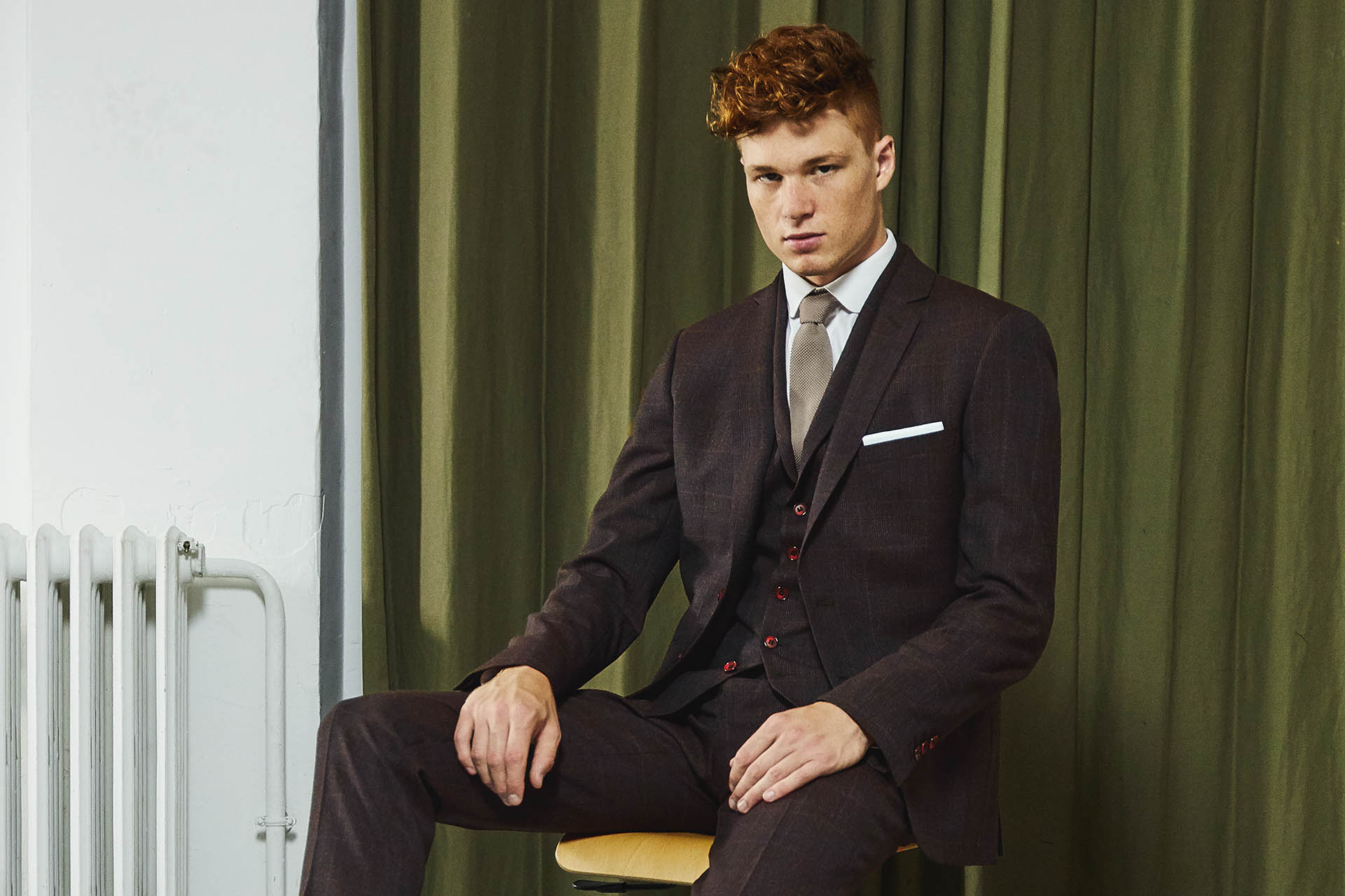 Les matières sont au cœur du vestiaire : flanelles texturées, tissus chinés et faux-unis apportent profondeur et chaleur aux teintes. Les motifs iconiques — Prince de Galles, pied-de-poule en tweed écossais — côtoient une rayure tennis affirmée sur un costume bordeaux en laine mate.