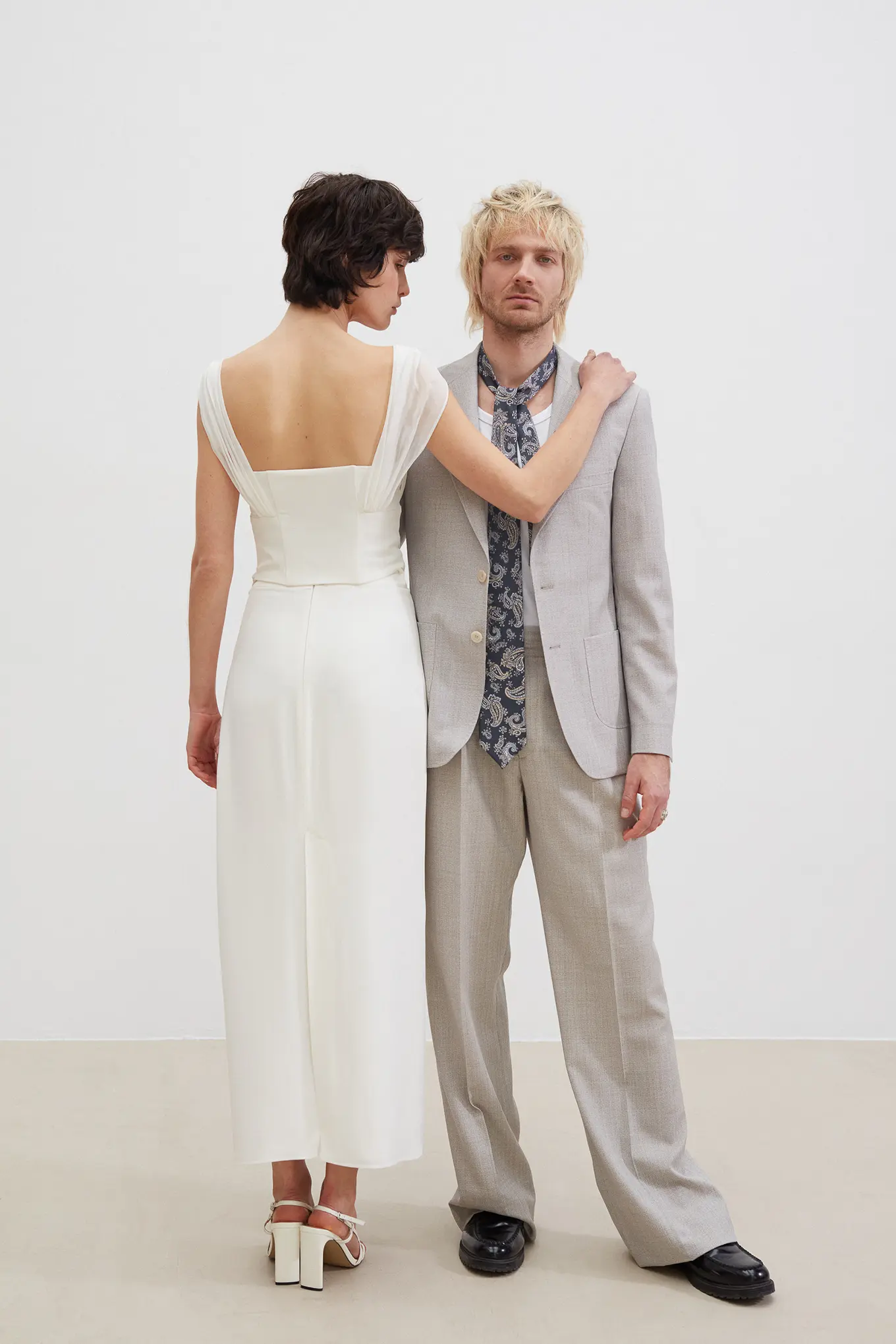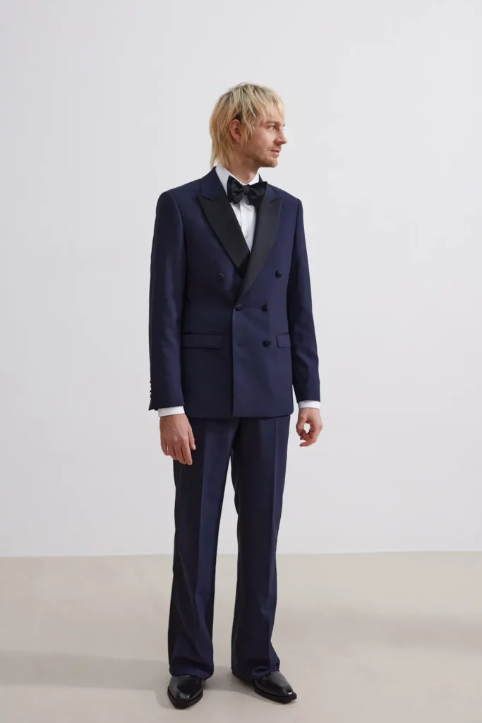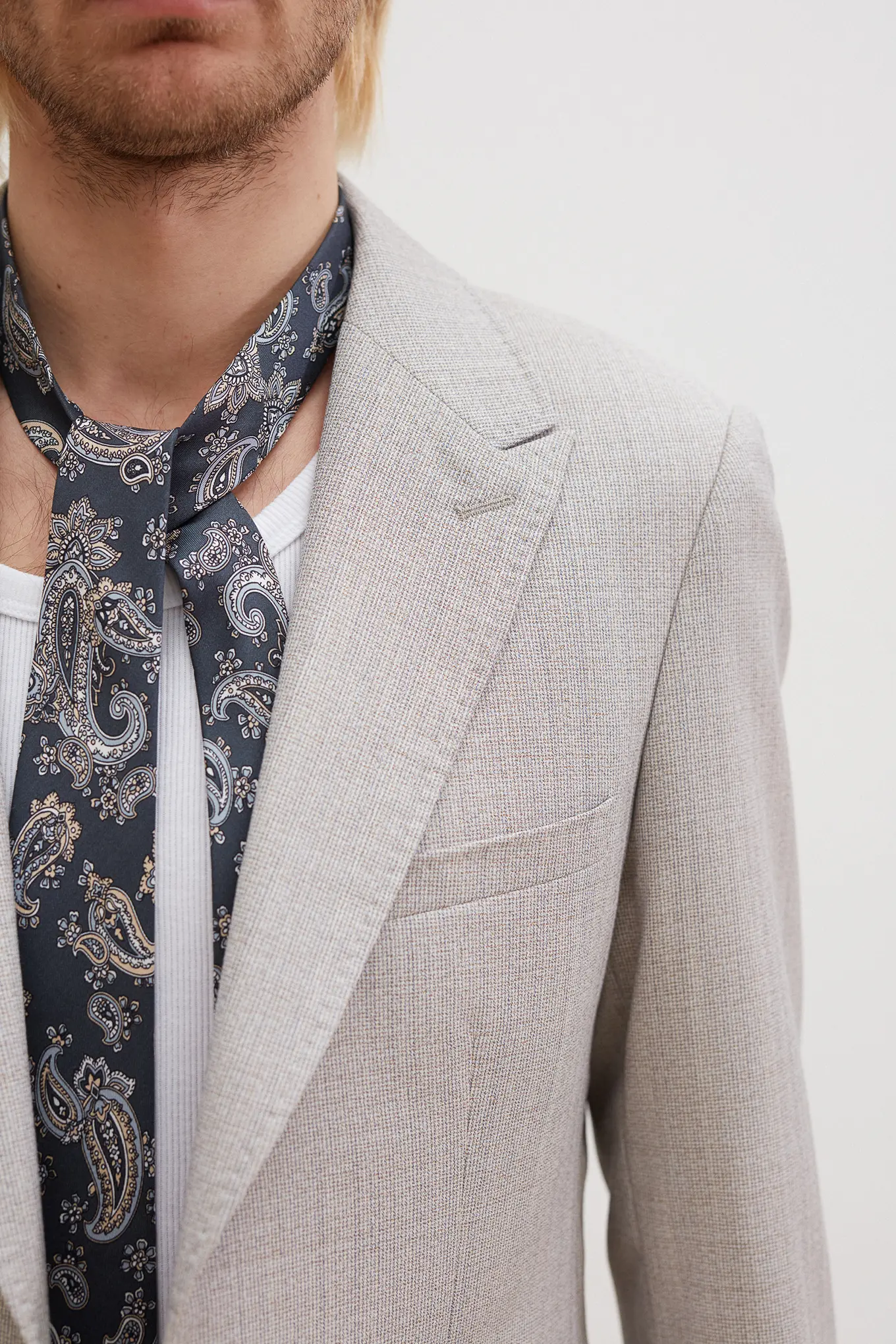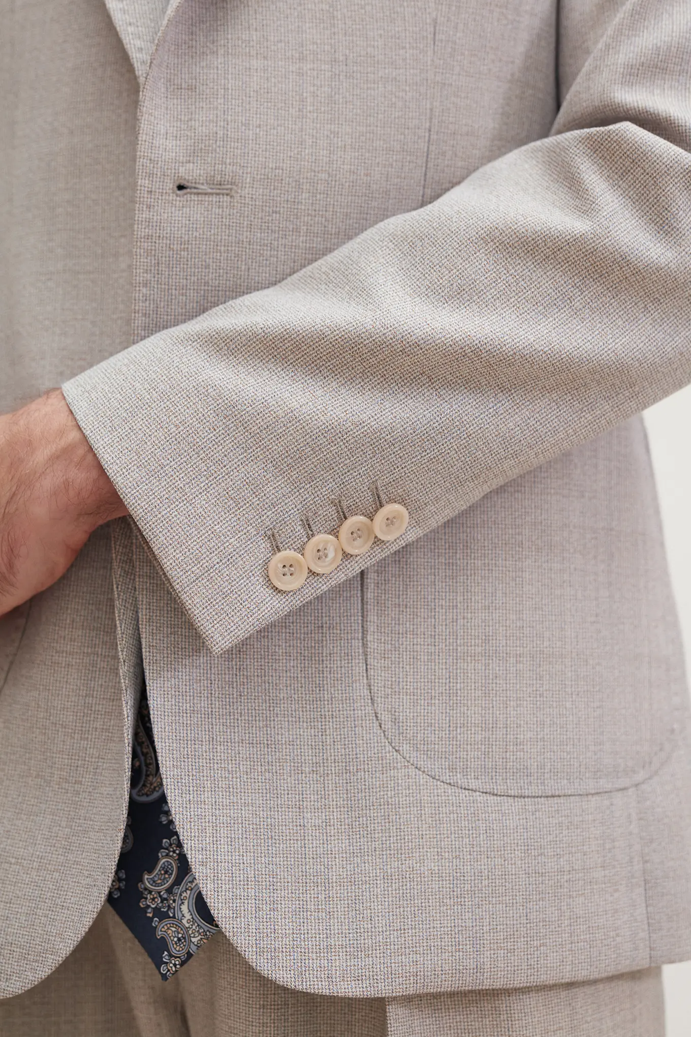Costume 2 pièces en toile chinée beige grisée sur mesure – 1090 €