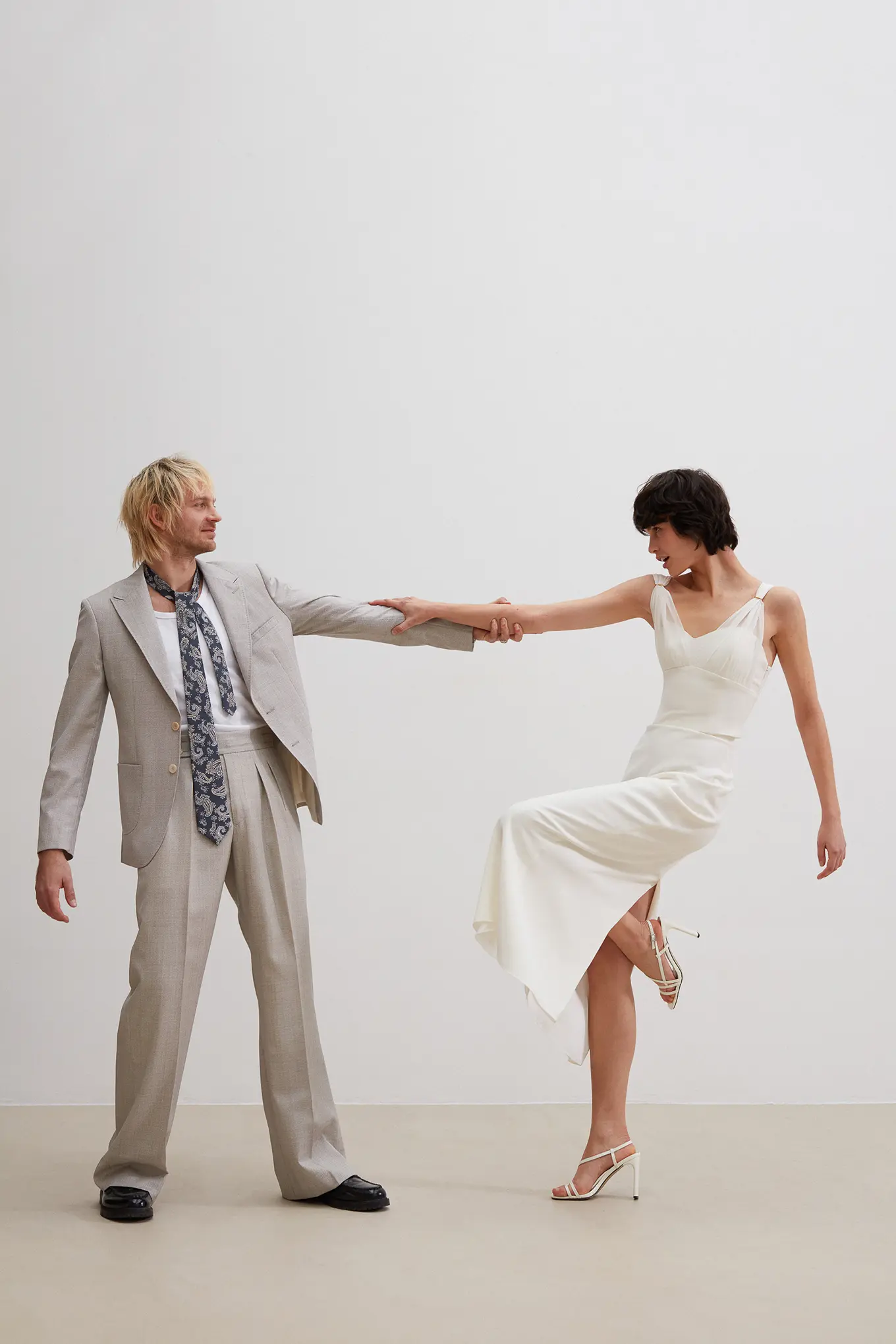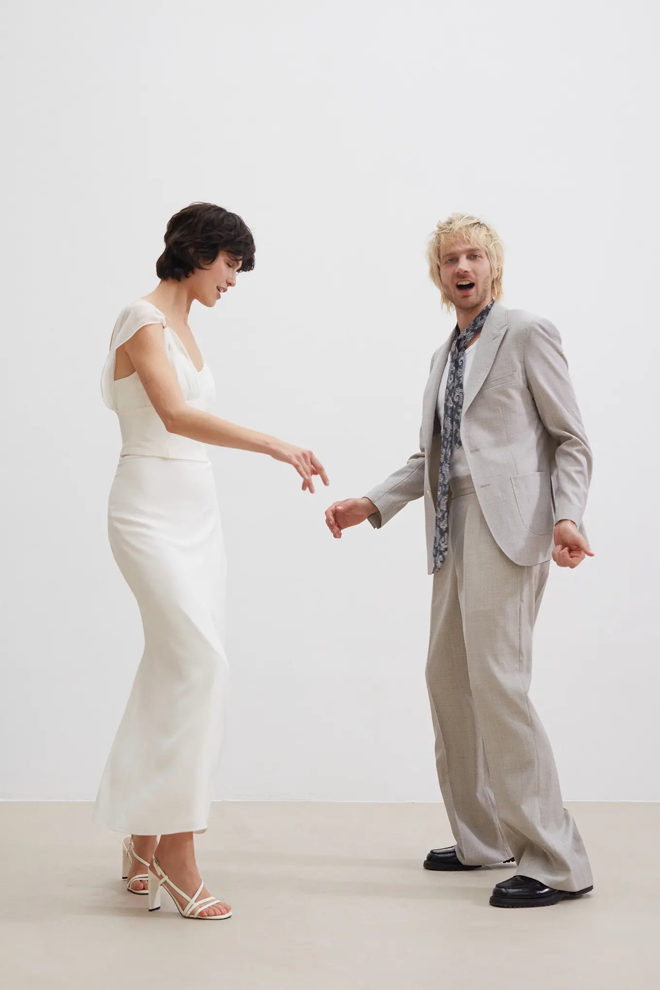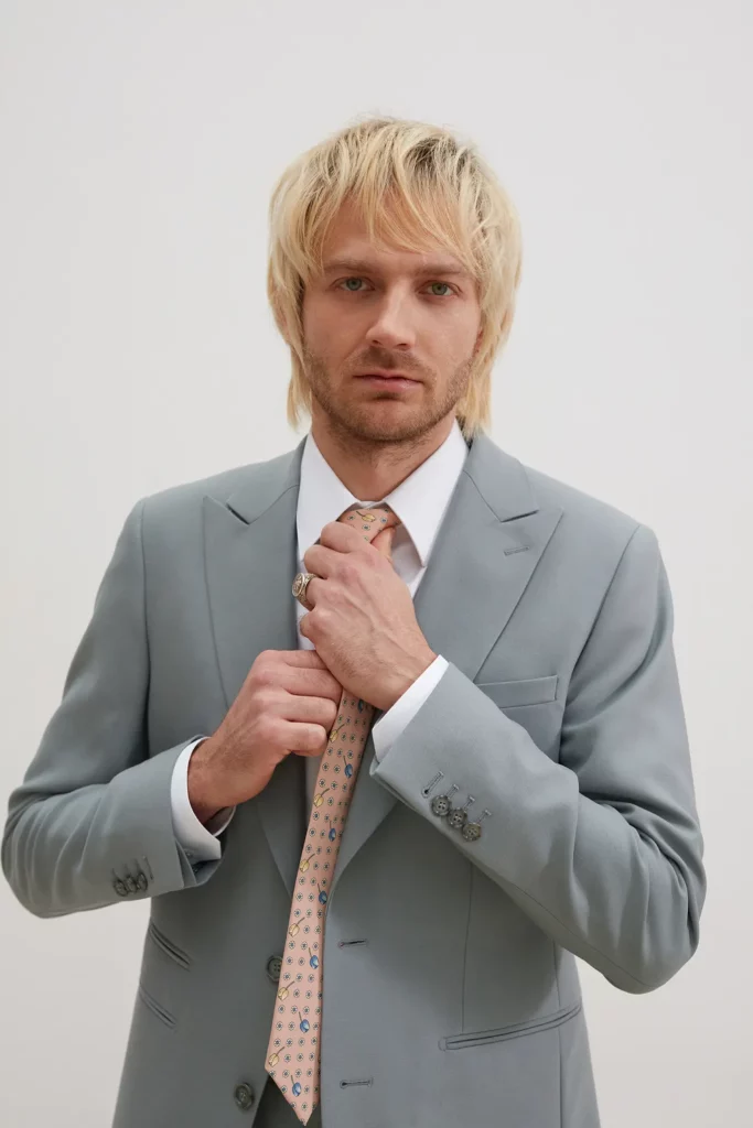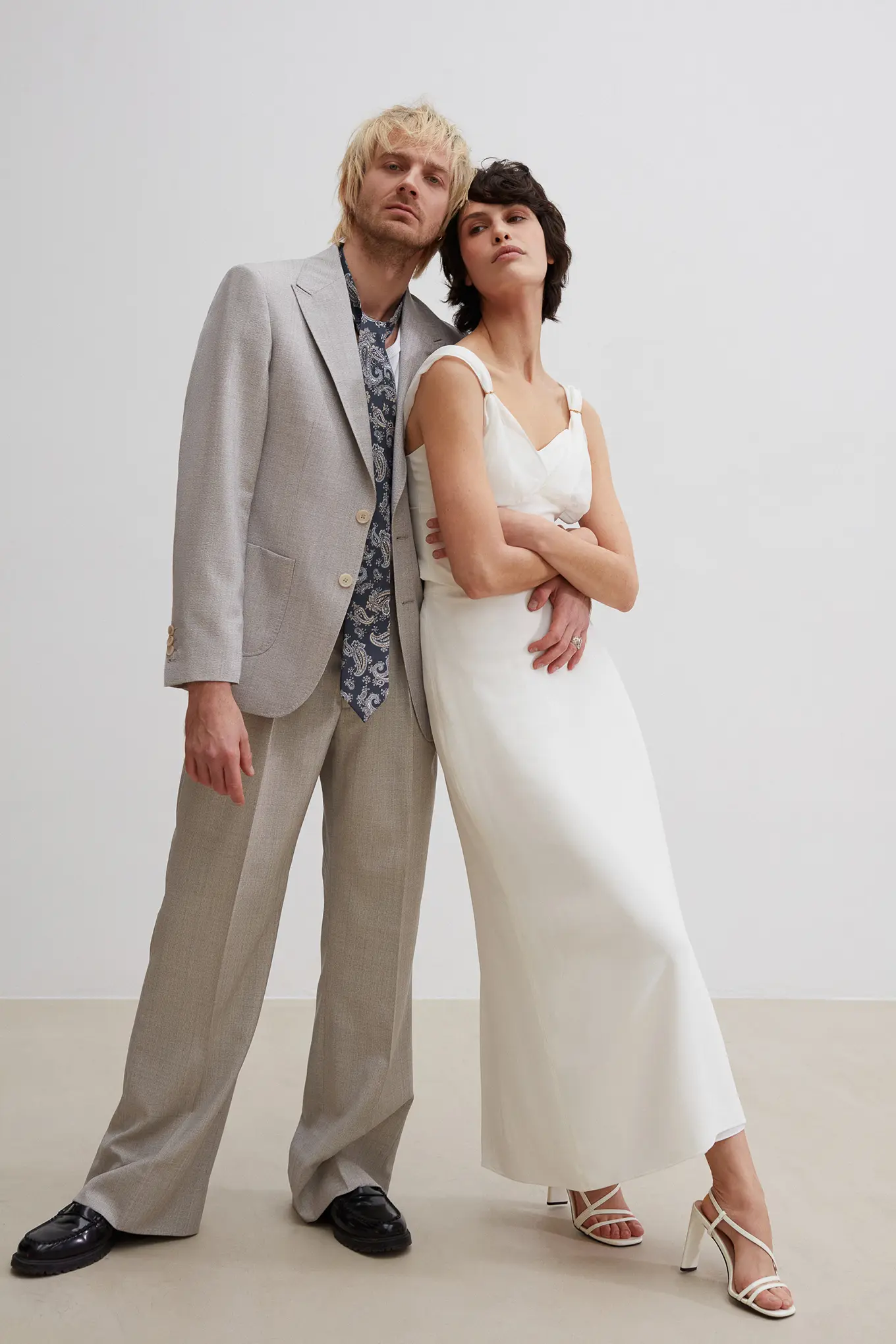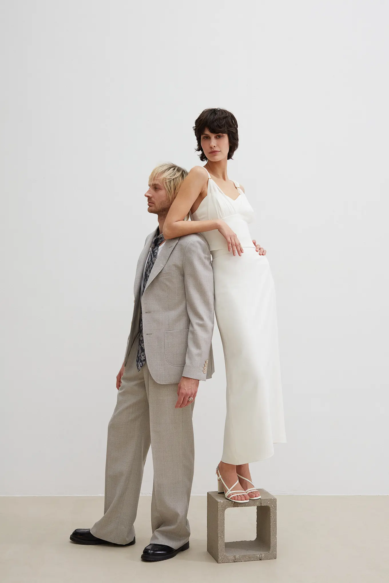 Costume 2 pièces en toile chinée beige grisée sur mesure – 1090 €
