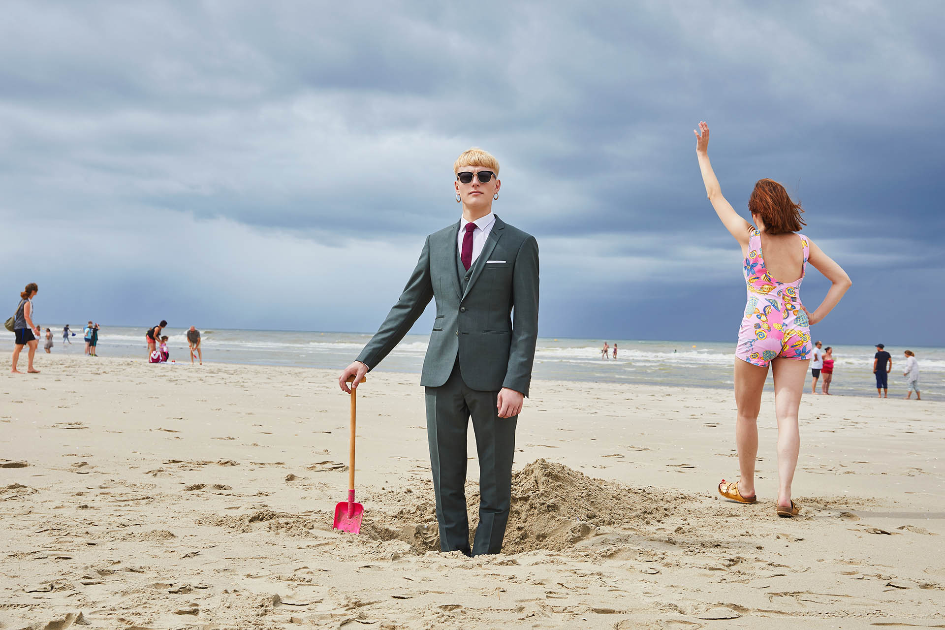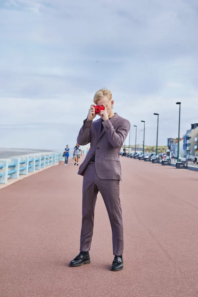 Costume 3 pièces sur mesure avec une veste à col doit, 2 boutons, 3 poches passepoilées droites et un gilet droit.