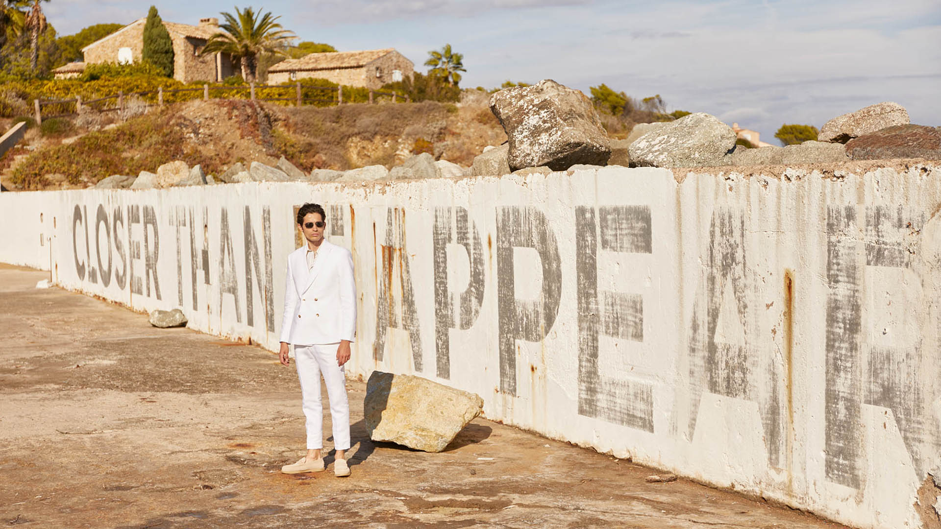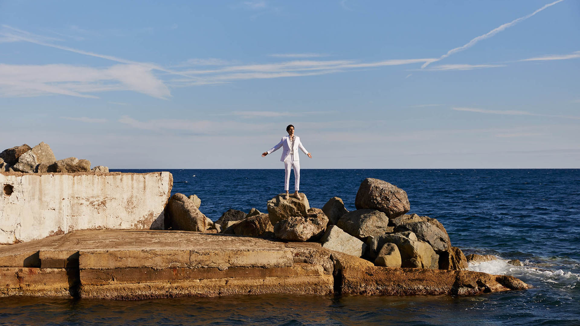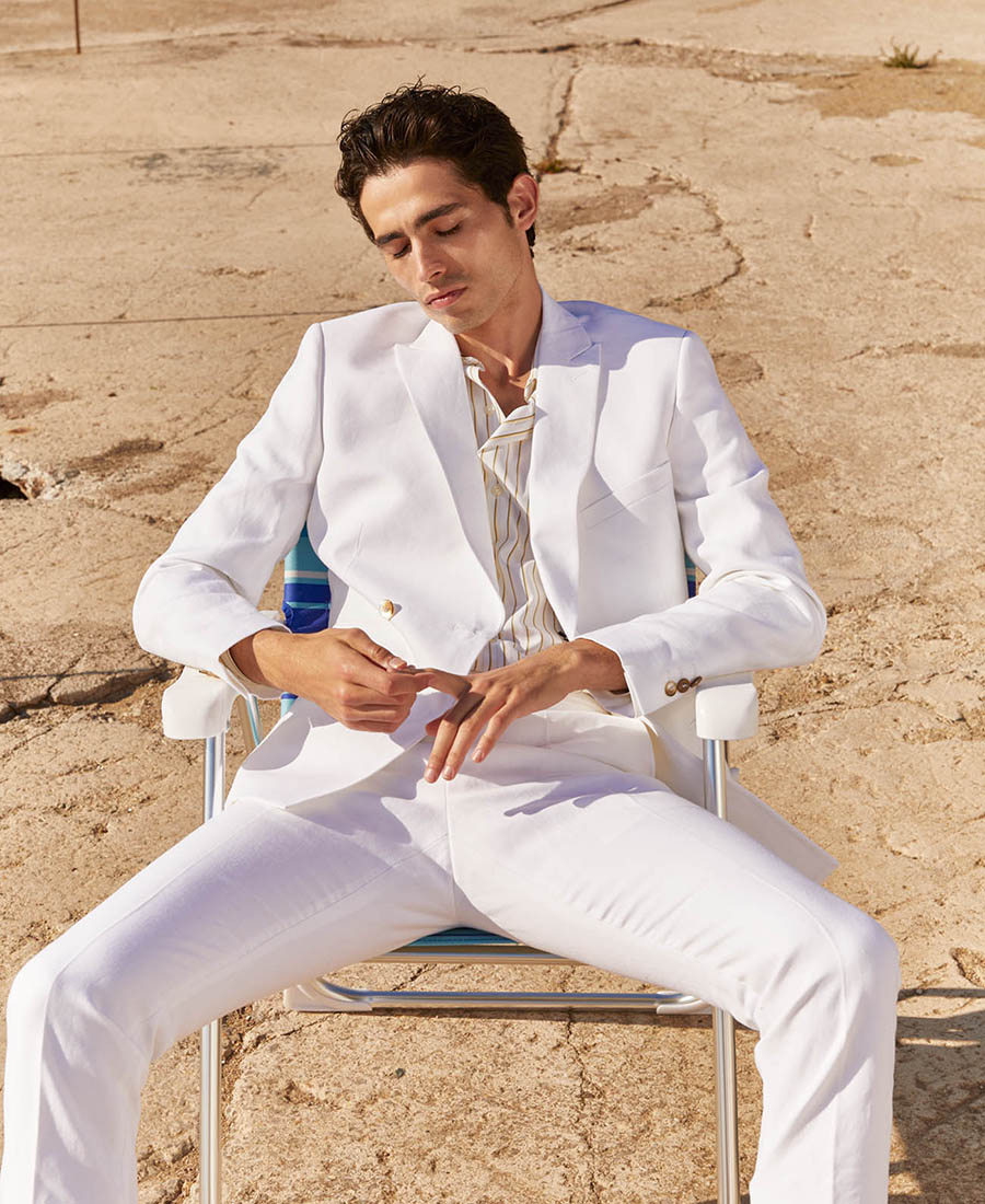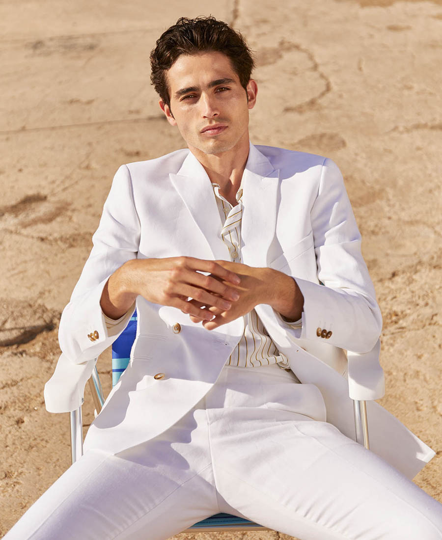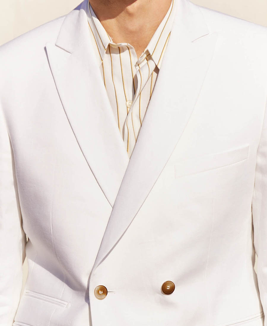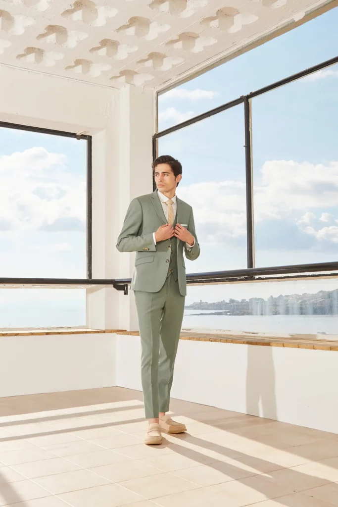 Costume 2 pièces sur mesure avec une veste croisée 4 boutons à col pointe et 3 poches droites passepoilées – 1340€