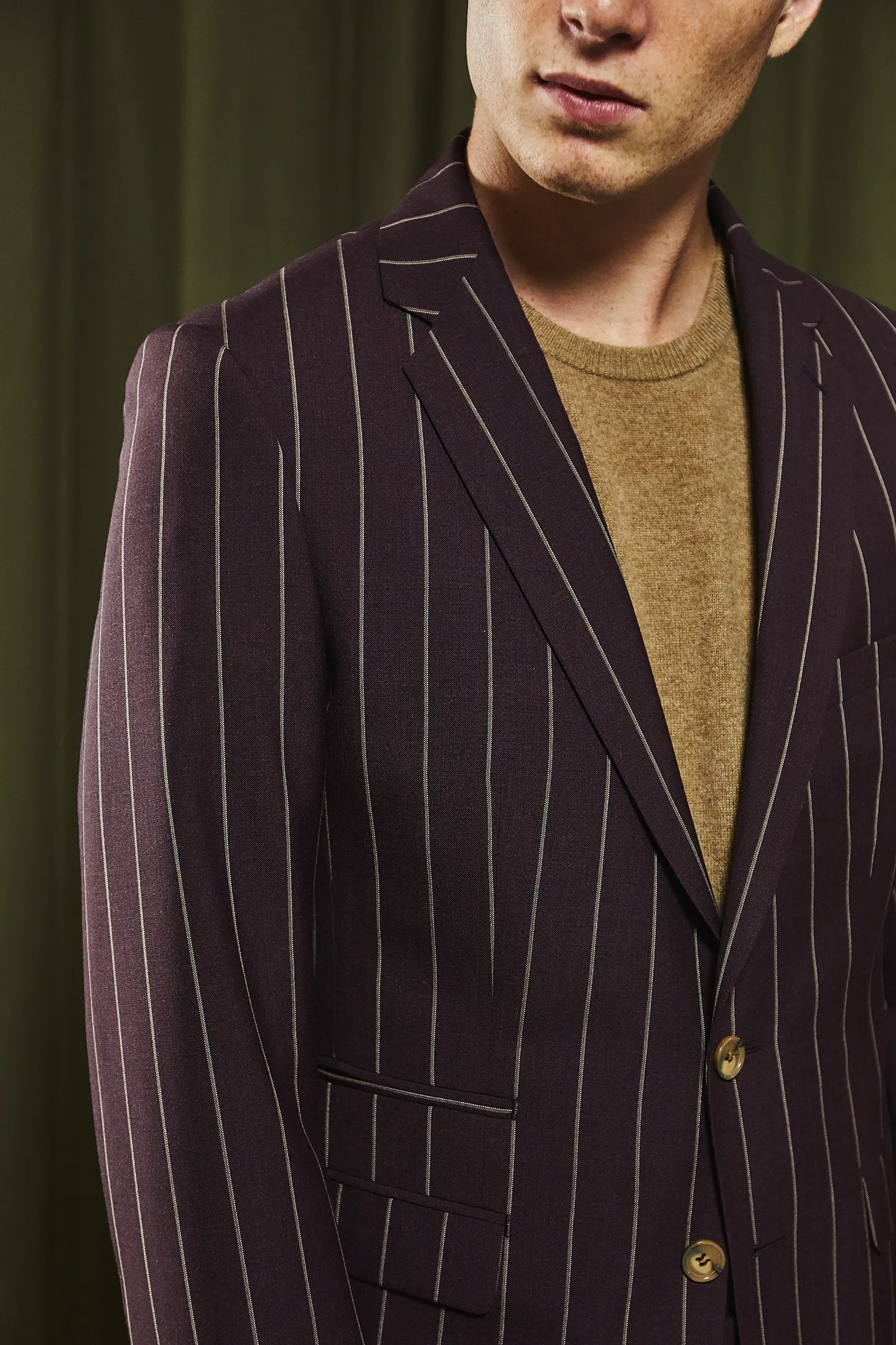 Costume 2 pièces sur mesure avec une veste à col droit, 2 boutons contrastés, 2 poches droites à rabats et une poche ticket passepoilée.