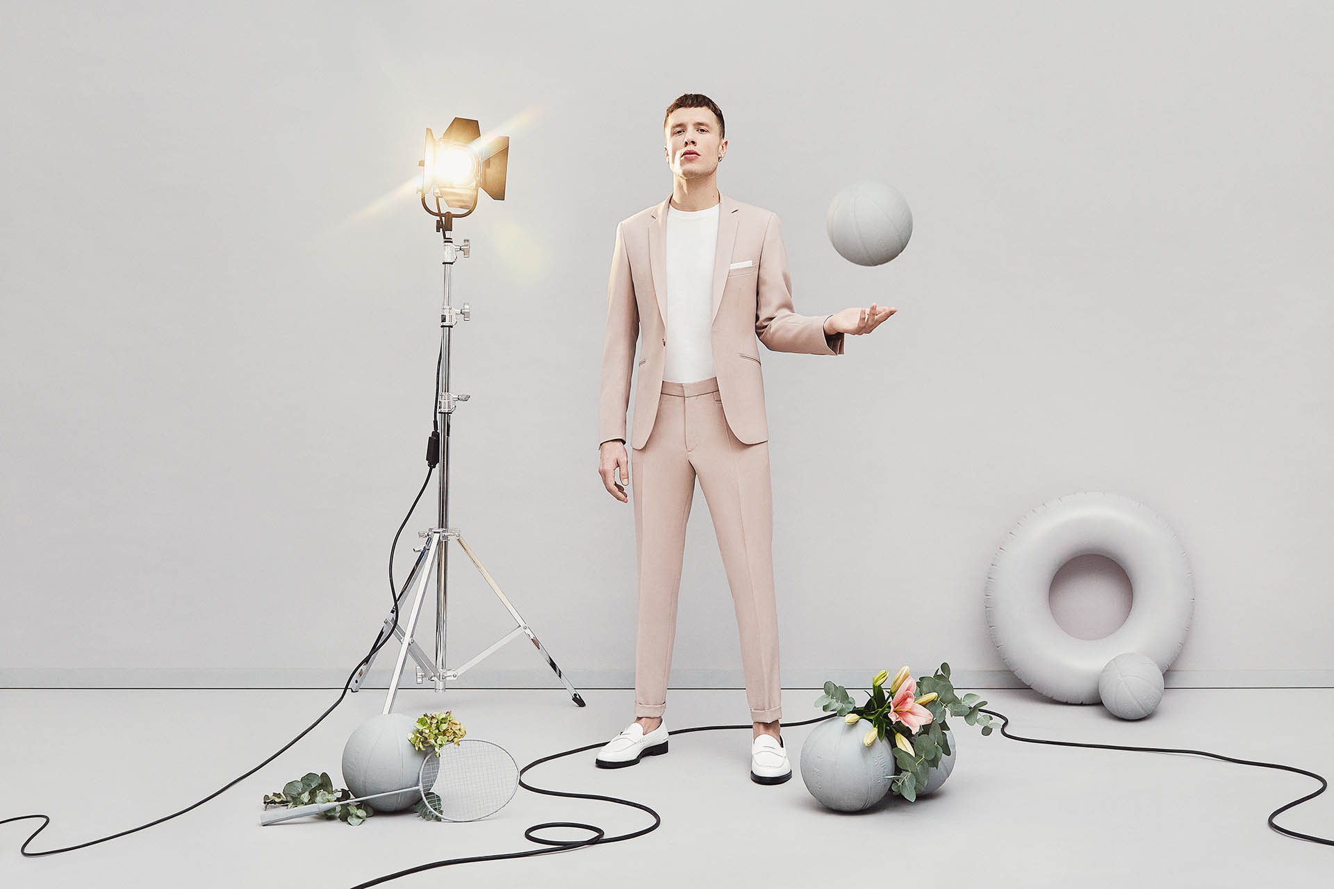 Costume 2 pièces sur mesure avec une veste à col droit, 1 bouton et 2 poches en biais passepoilées.