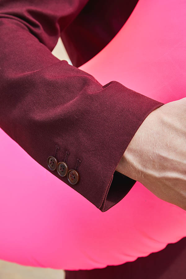 Costume 2 pièces sur mesure avec une veste à col châle, 1 bouton et 2 poches passepoilées en biais.