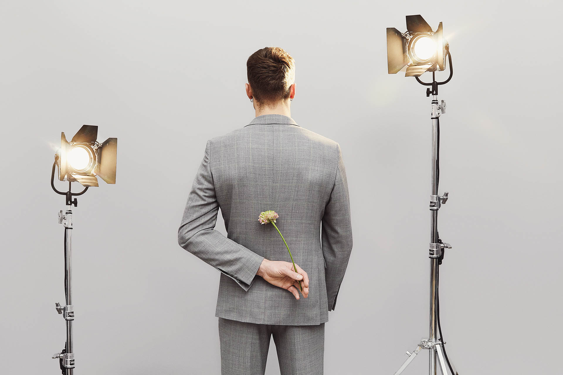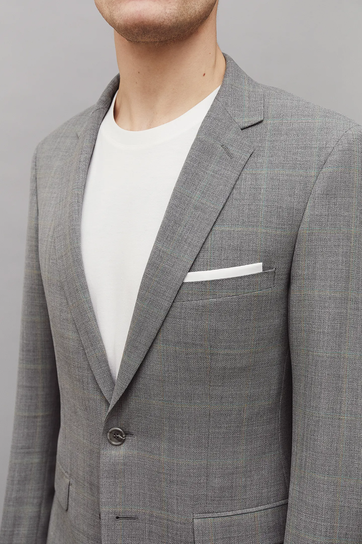 Costume 2 pièces sur mesure avec une veste à col droit, 2 boutons et 2 poches droites à rabats.