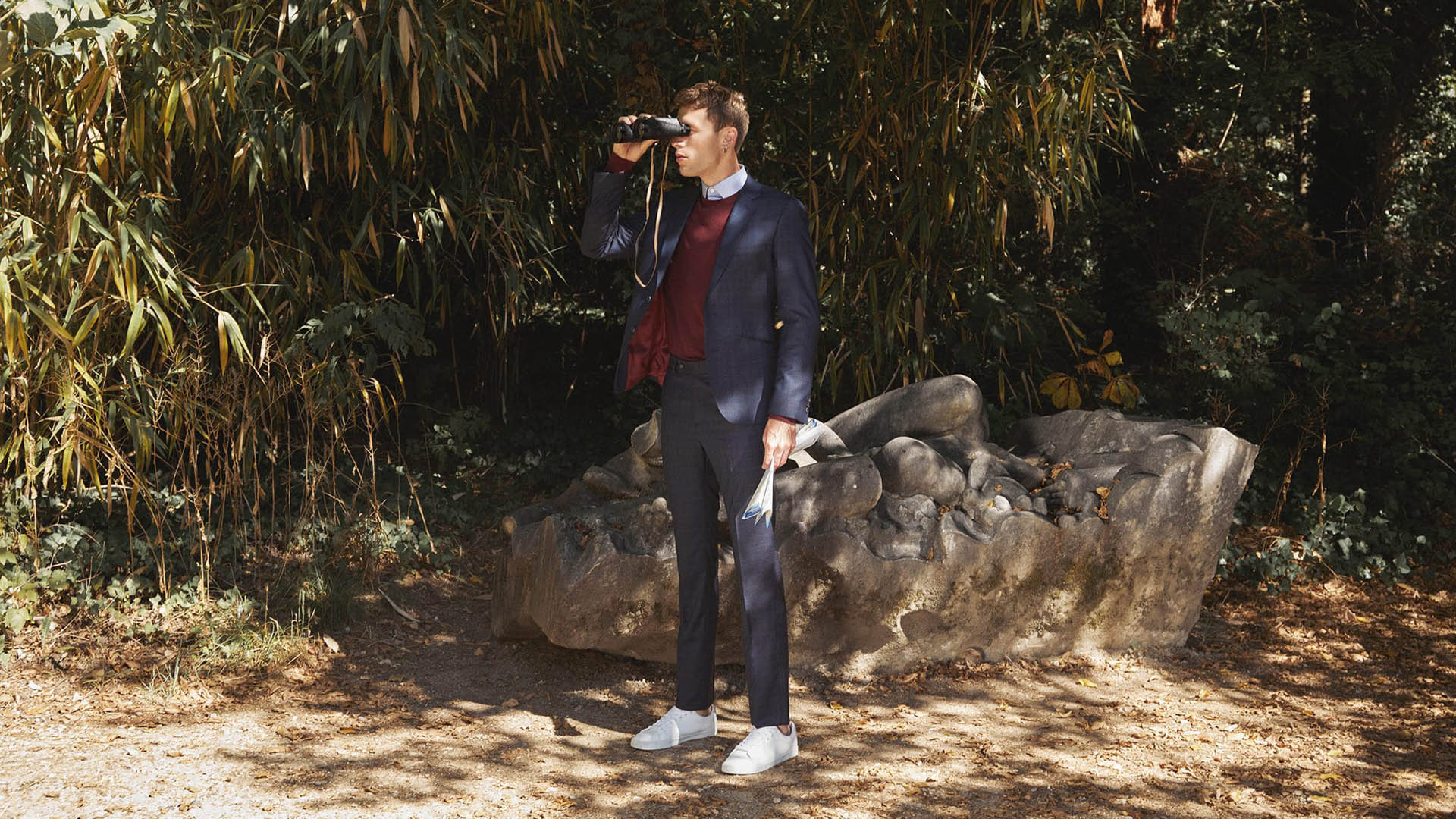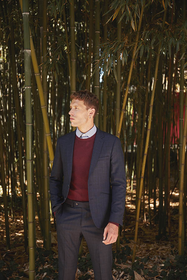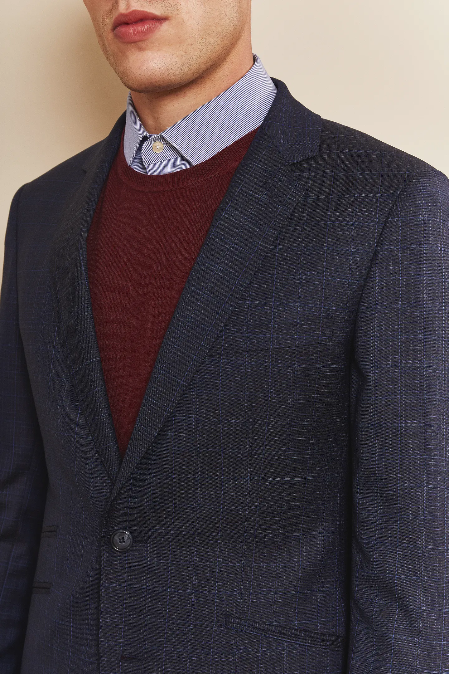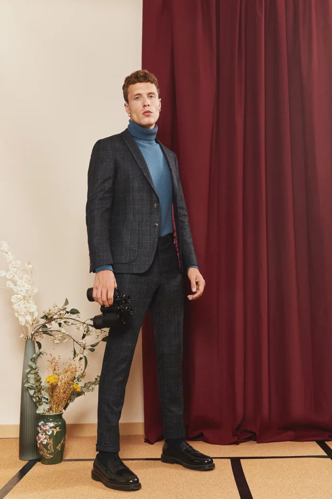 Costume 2 pièces sur mesure avec une veste à col cran ouvert, 2 boutons, 3 poches passepoilées en biais et première boutonnière de la manche bordeaux.