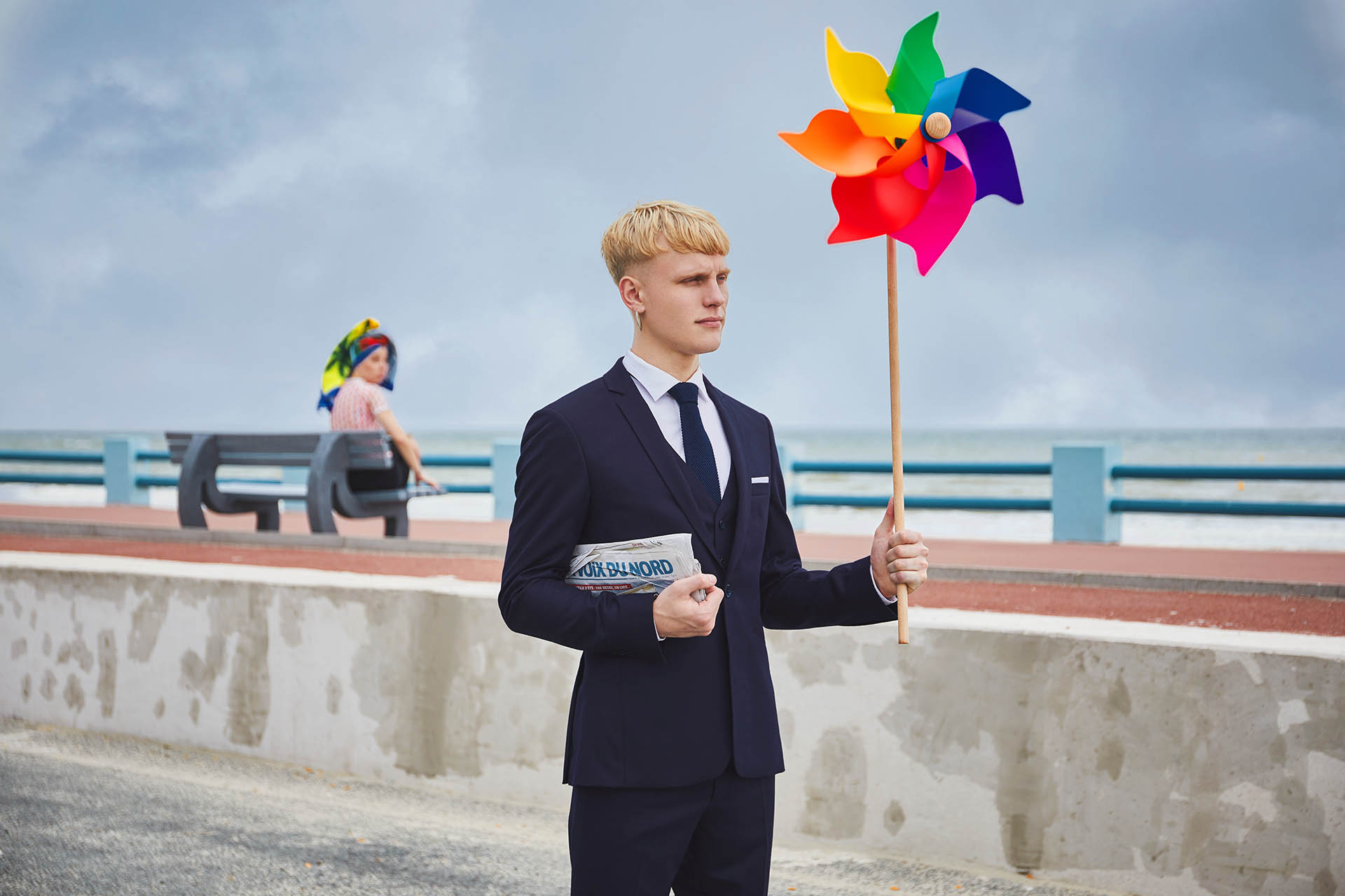 Costume 3 pièces sur mesure avec une veste à col droit, 2 boutons, 3 poches passepoilées en biais et un gilet droit.
