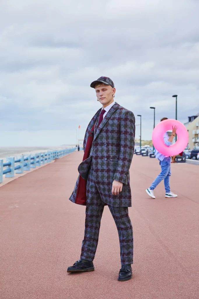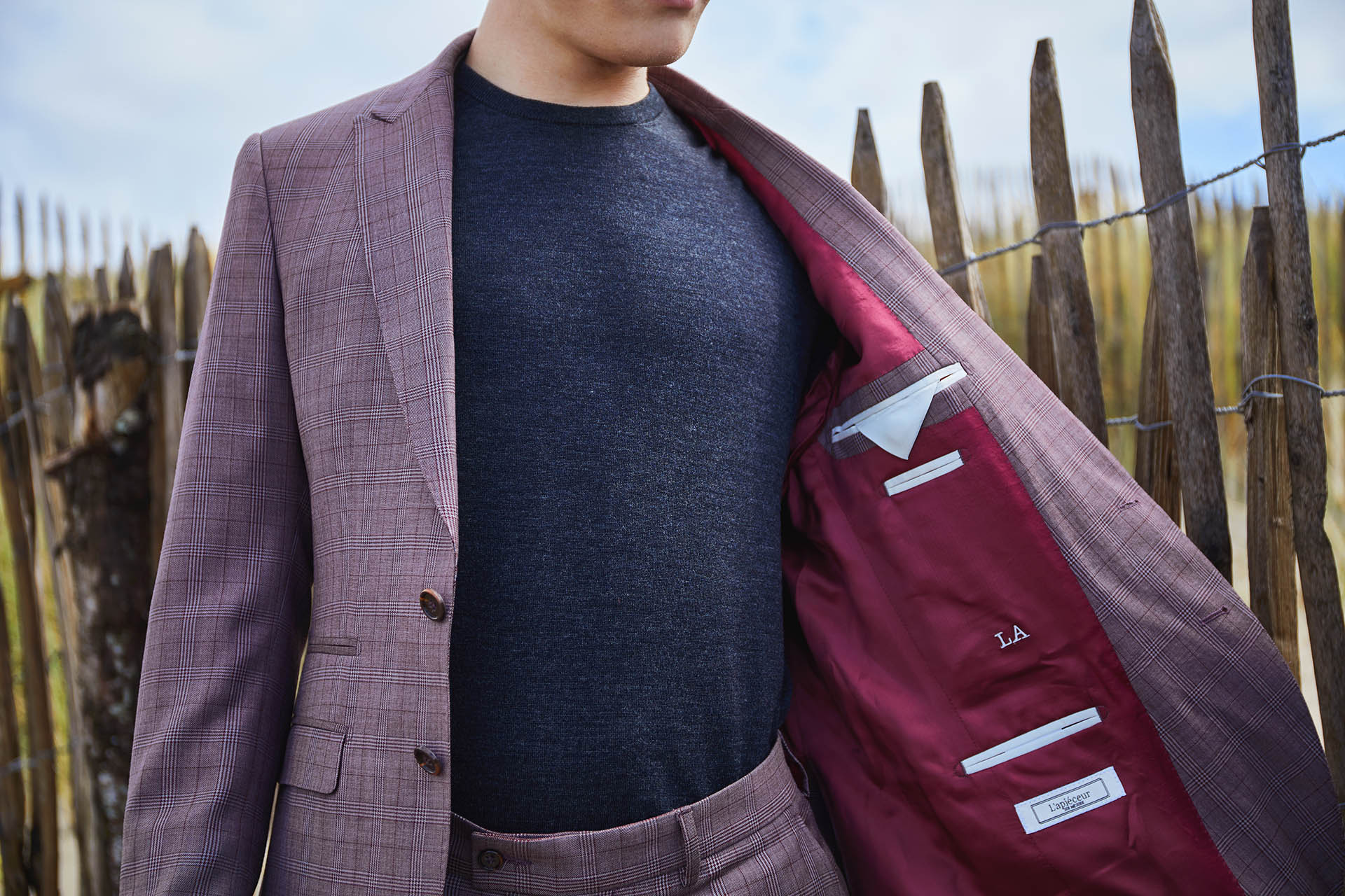 Costume 2 pièces sur mesure avec une veste à col pointe à revers larges, 2 boutons, 2 poches droites à rabats et une poche ticket passepoilée.