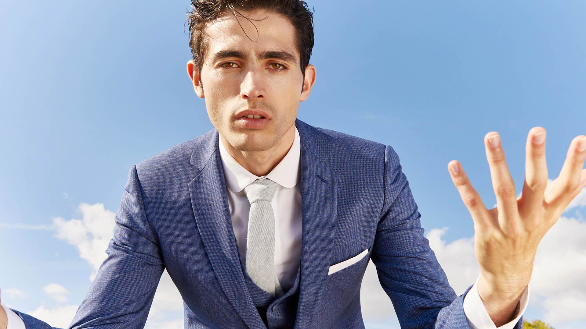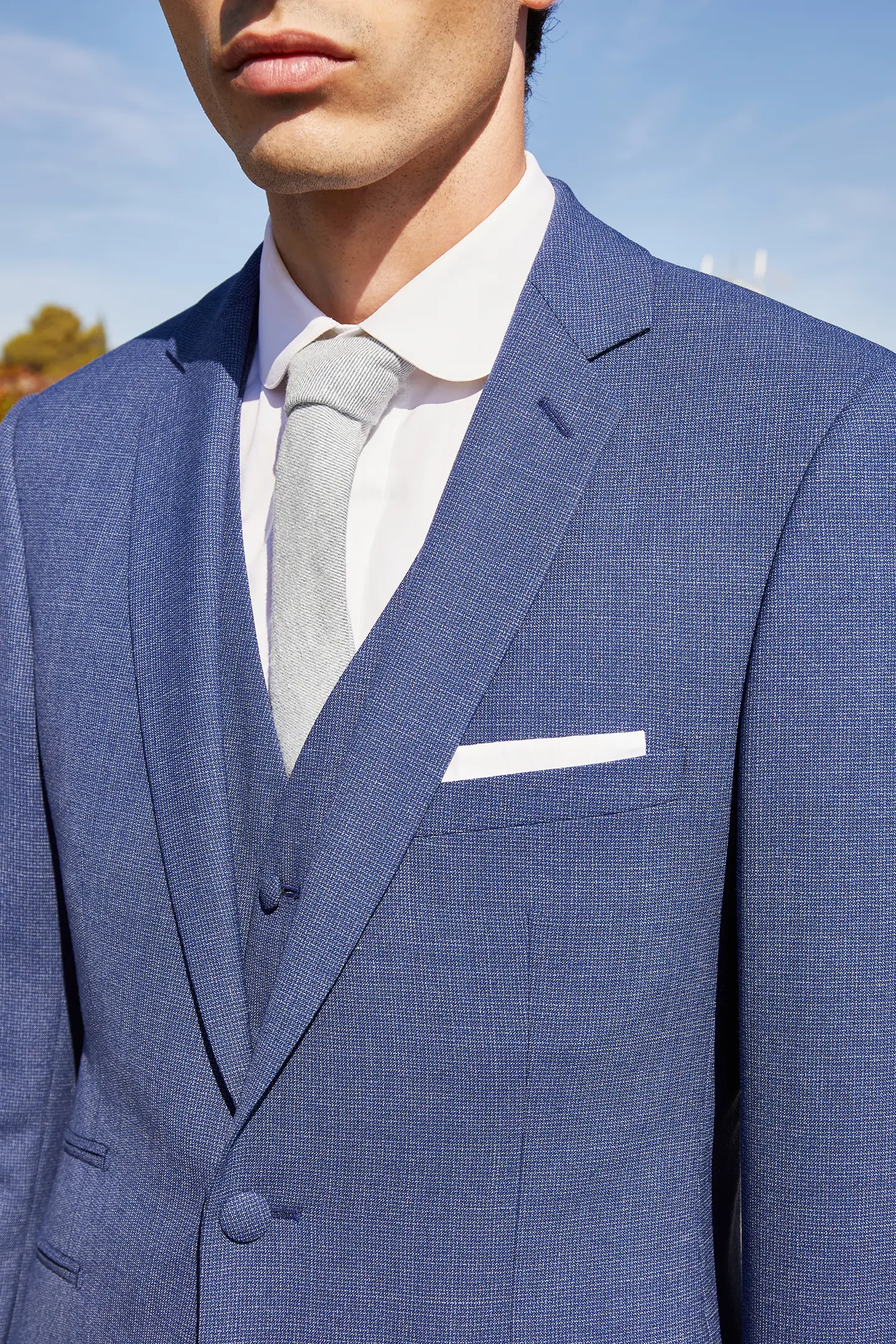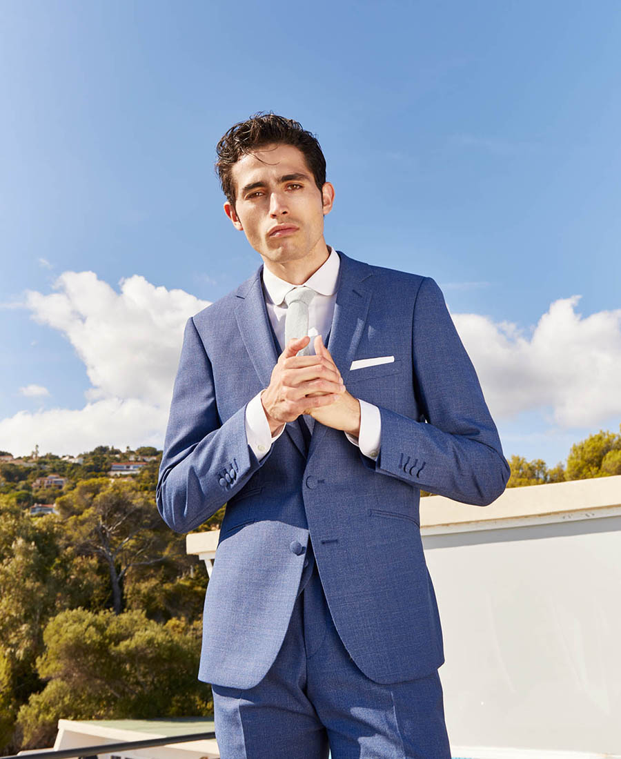 Costume 3 pièces sur mesure avec une veste à col cran ouvert, 2 boutons couverts, 2 poches en biais à sans rabat et 1 poche ticket passepoilée – 1590€
