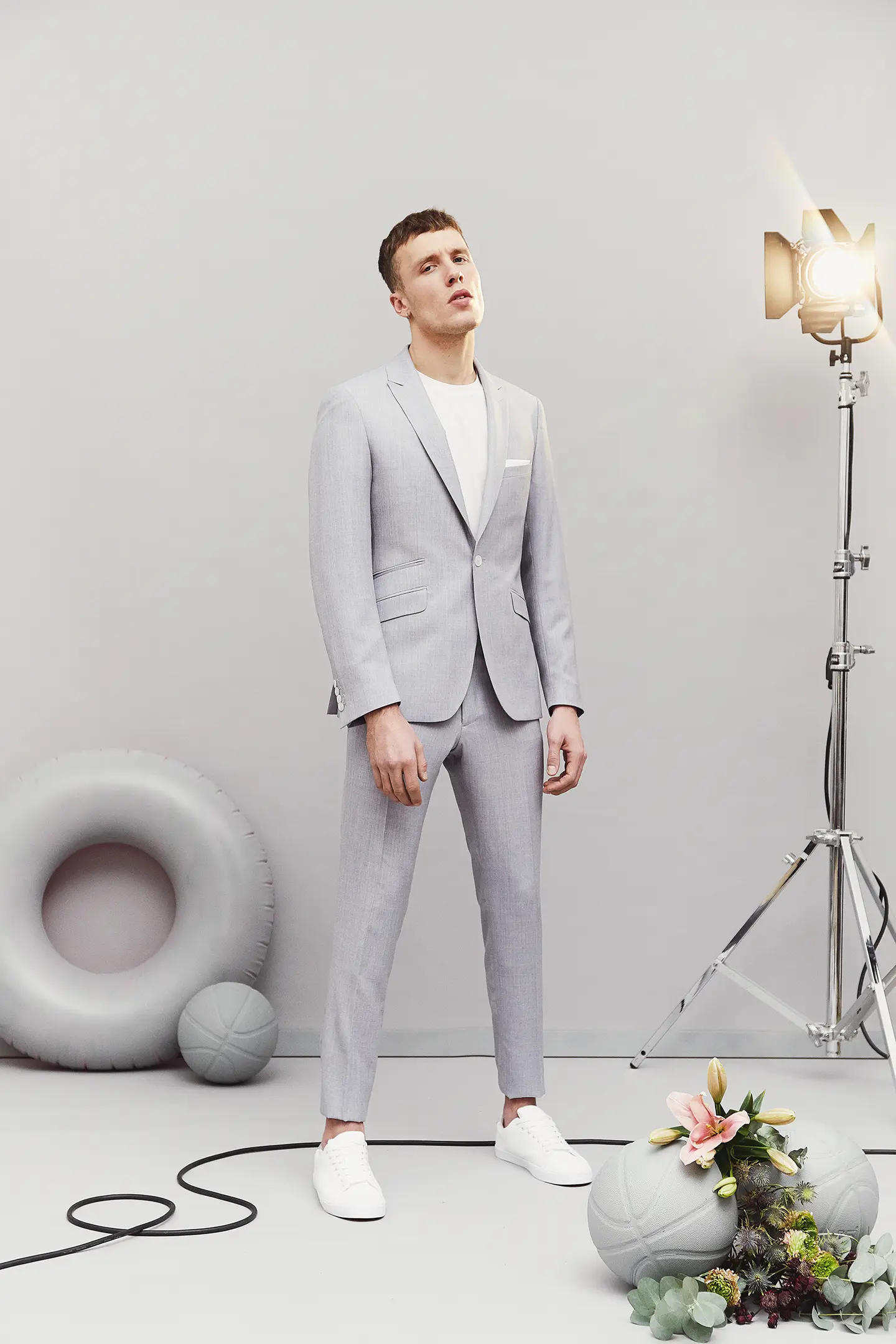 Costume 2 pièces sur mesure avec une veste à col pointe, 1 bouton, 2 poches en biais à rabats et une poche ticket passepoilée.