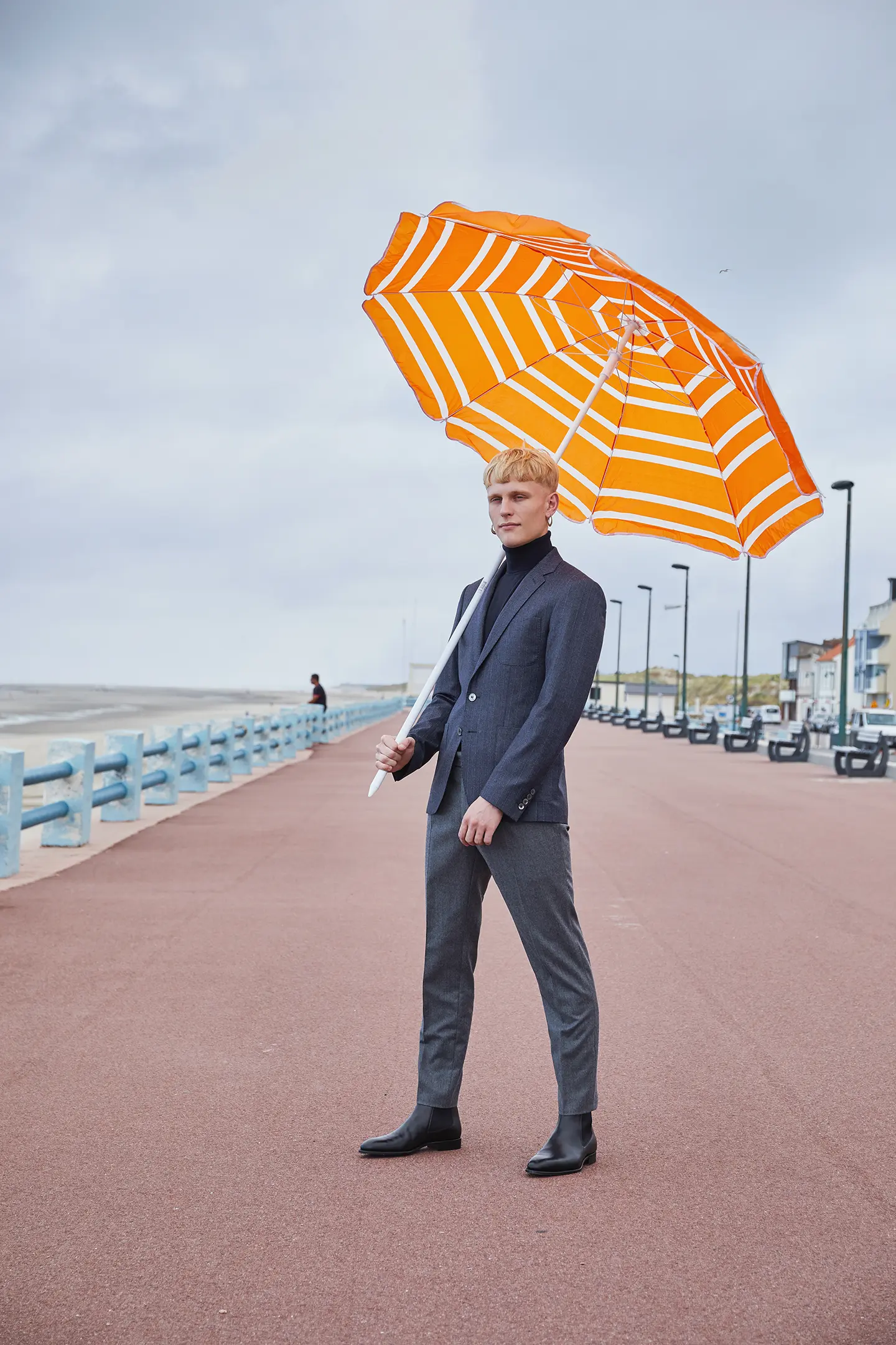 Pantalon sur mesure, modèle à pinces, avec pattes de serrage boutonnées, poches italiennes et deux poches revolver.