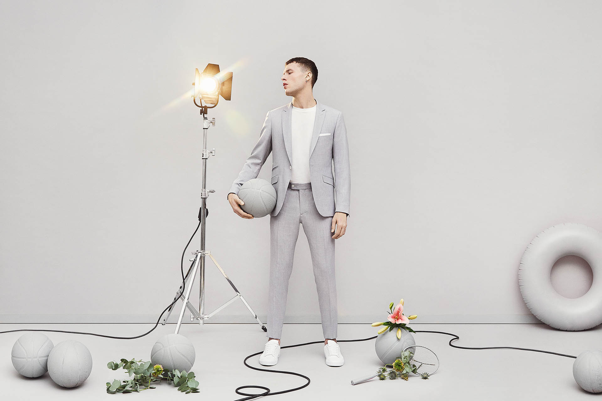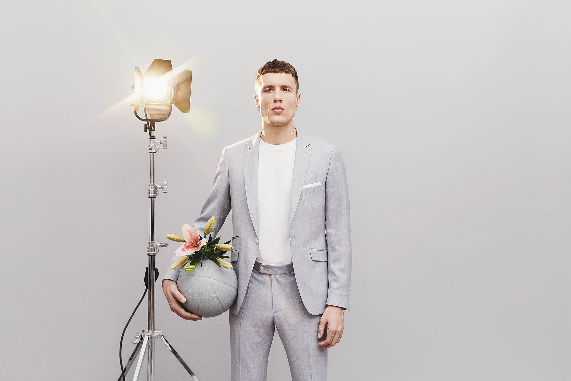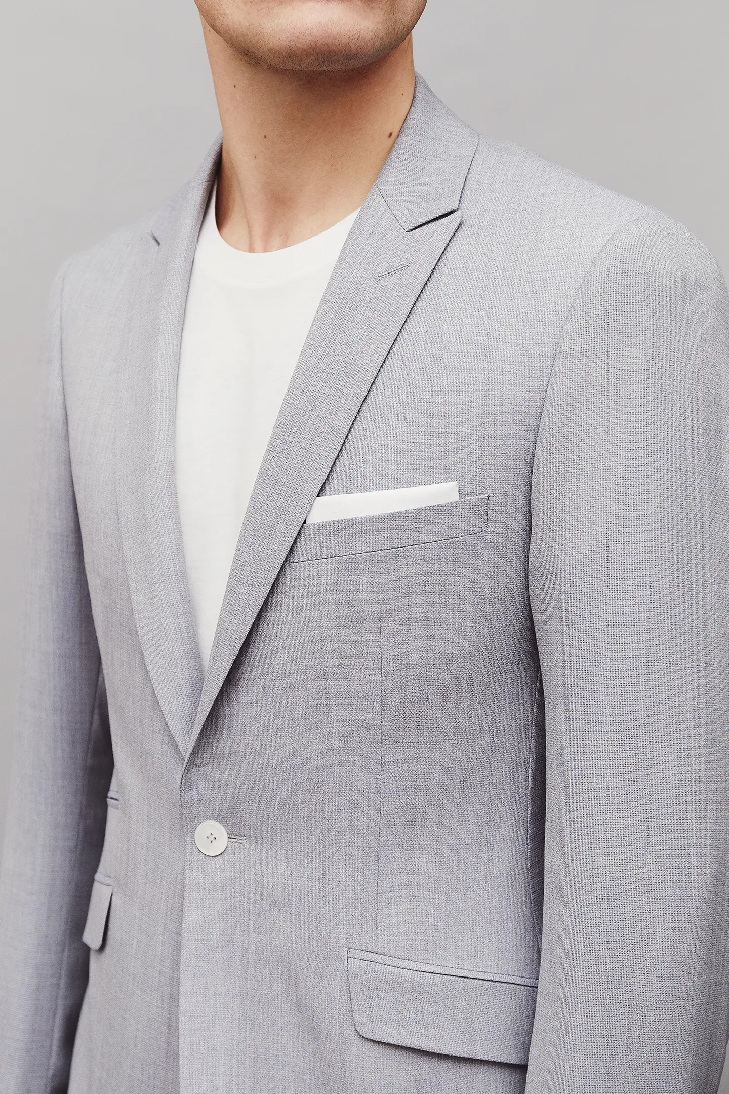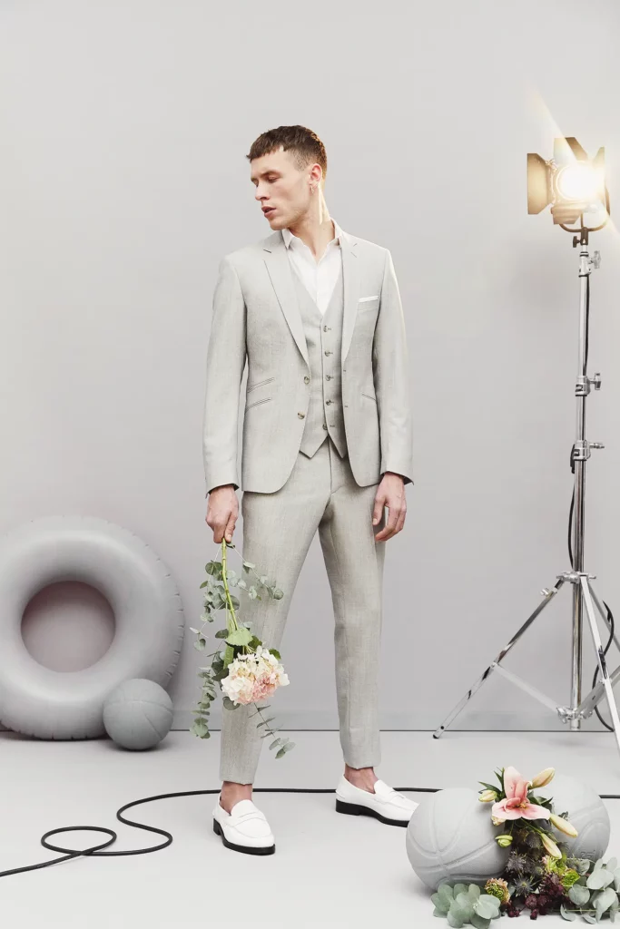 Costume 2 pièces sur mesure avec une veste à col pointe, 1 bouton, 2 poches en biais à rabats et une poche ticket passepoilée.