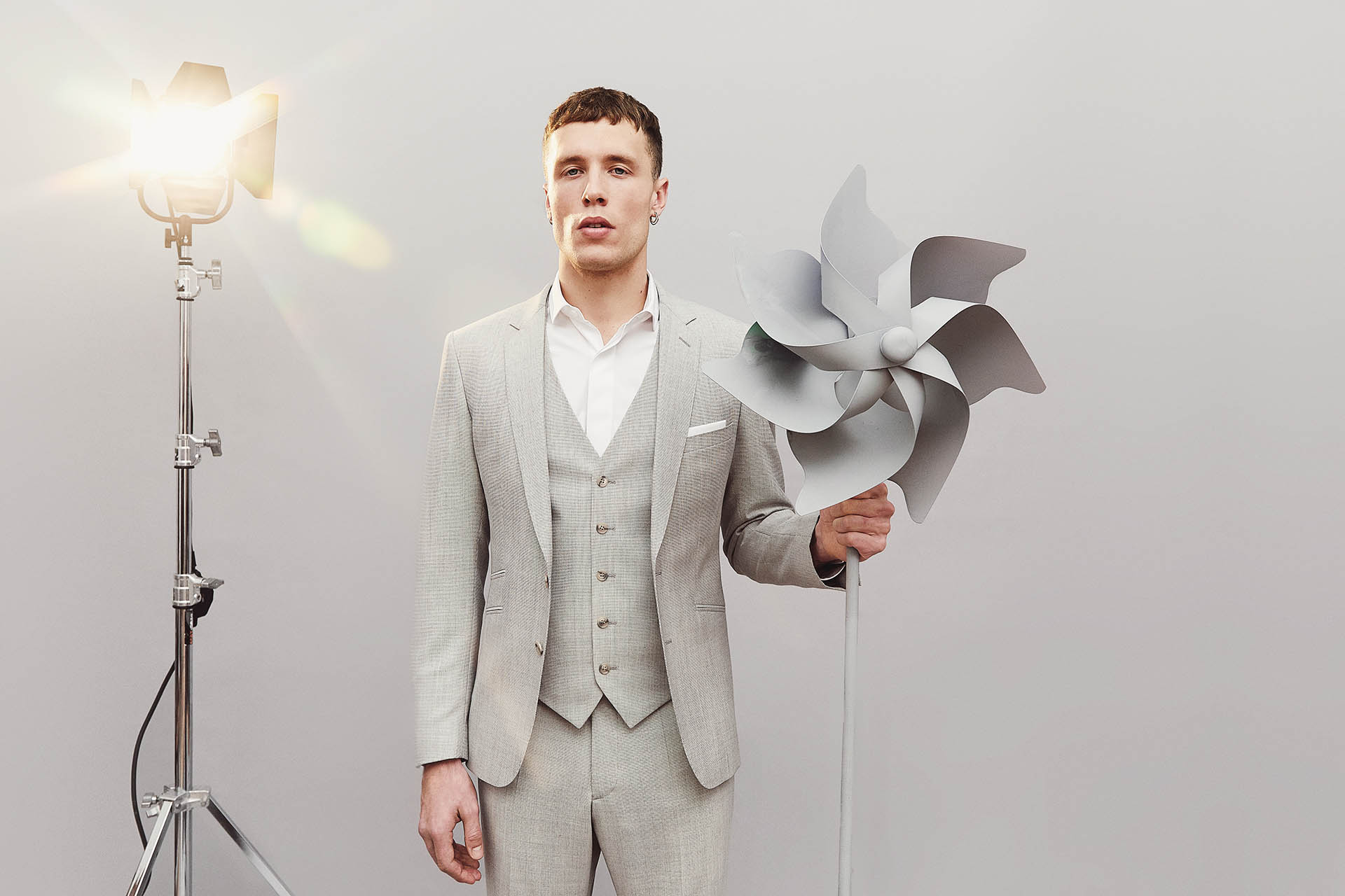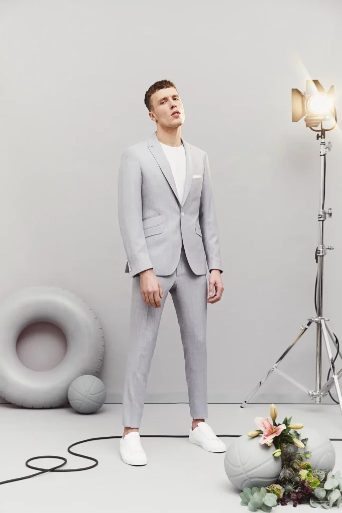 Costume 3 pièces sur mesure avec une veste à col droit, 2 boutons, 3 poches en biais passepoilées et un gilet droit.